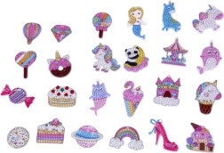 - 24 пластмасови висулки за украса с камъчета, 12 метални верижки, 12 пластмасови кукички/клипове, 2 тавички за камъчета, 2 восъка, 2 апликационни писалки, >3000 камъчета