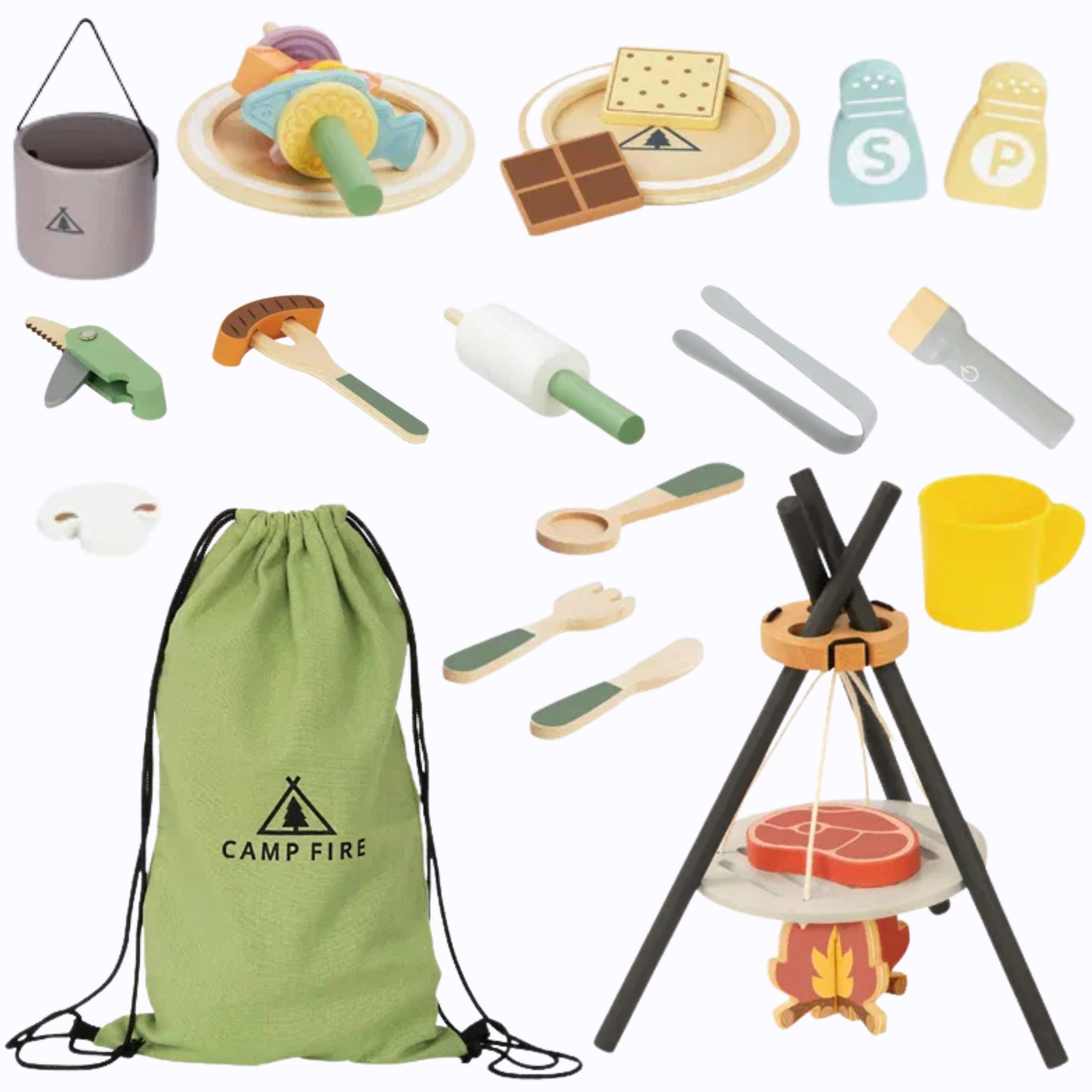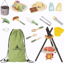 Този оригинален комплект пренася децата в света на къмпинга: палатки, лагерни огньове и готвене с приятели. Дървените елементи са приятни на допир и издръжливи, като същевременно са безопасни за ежедневна игра. Идеален за деца от 3 години, които обичат да имитират възрастните и да тренират социални умения.