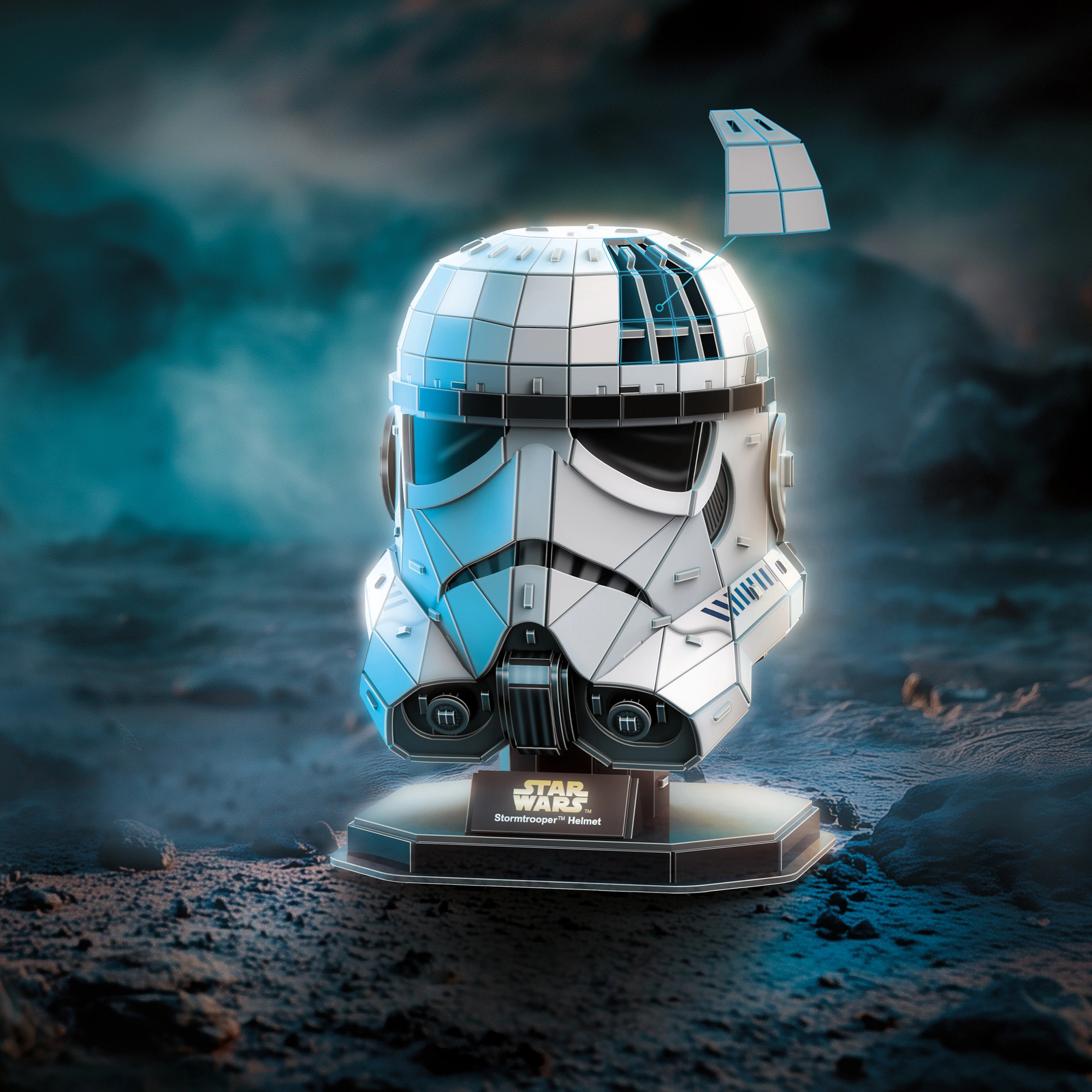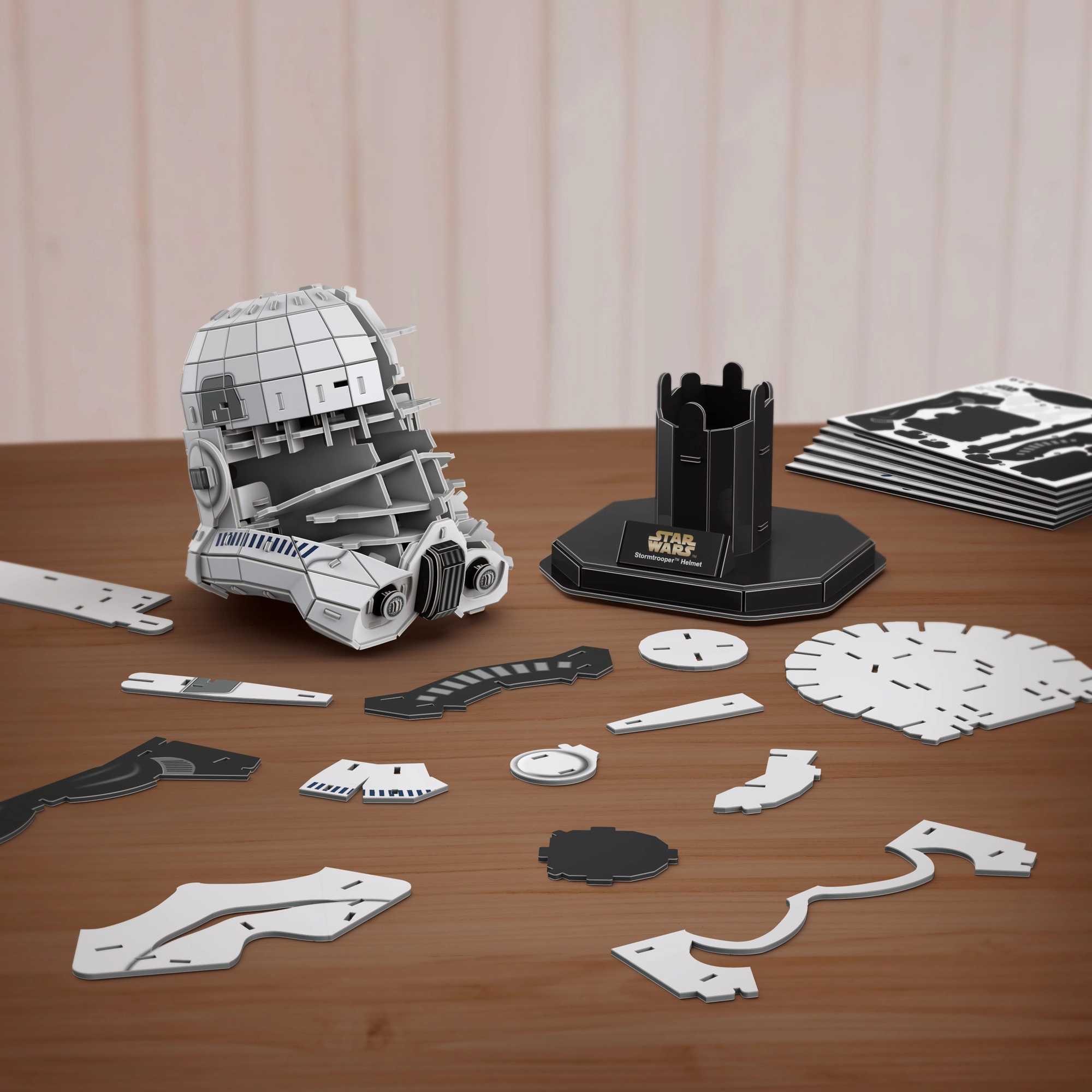 Този прецизно проектиран 3D модел на каската на щурмовак ще зарадва всеки фен на Star Wars. Комплектът включва 121 предварително изрязани части върху 6 картона, които лесно се отделят и сглобяват следвайки ясните инструкции. Резултатът е компактен модел с размери 12 × 12 × 16 cm със стойка и табелка за впечатляващо излагане.