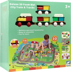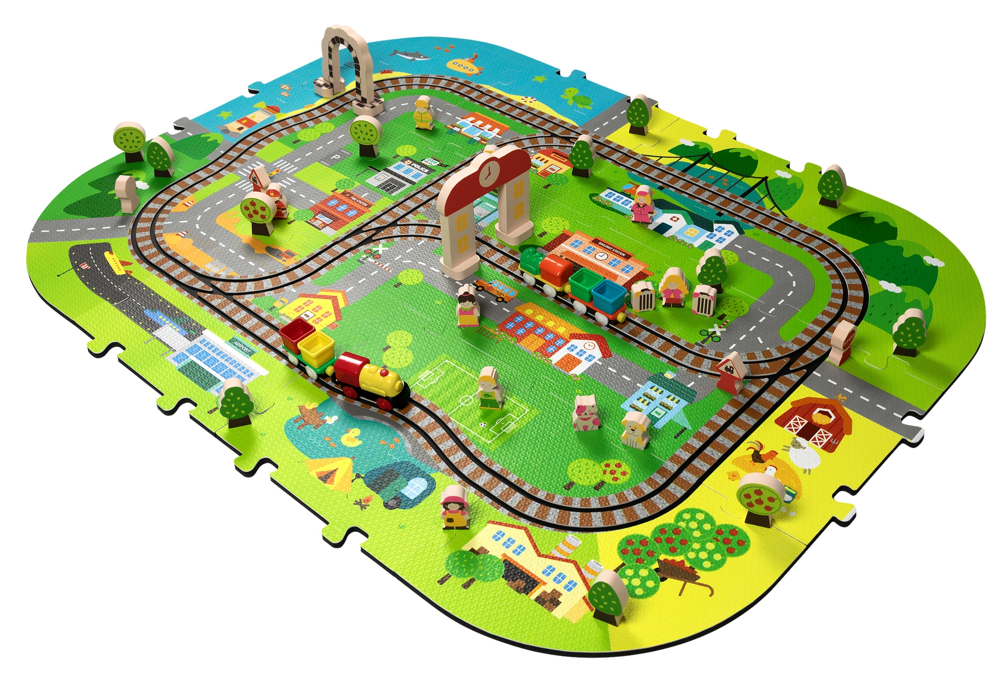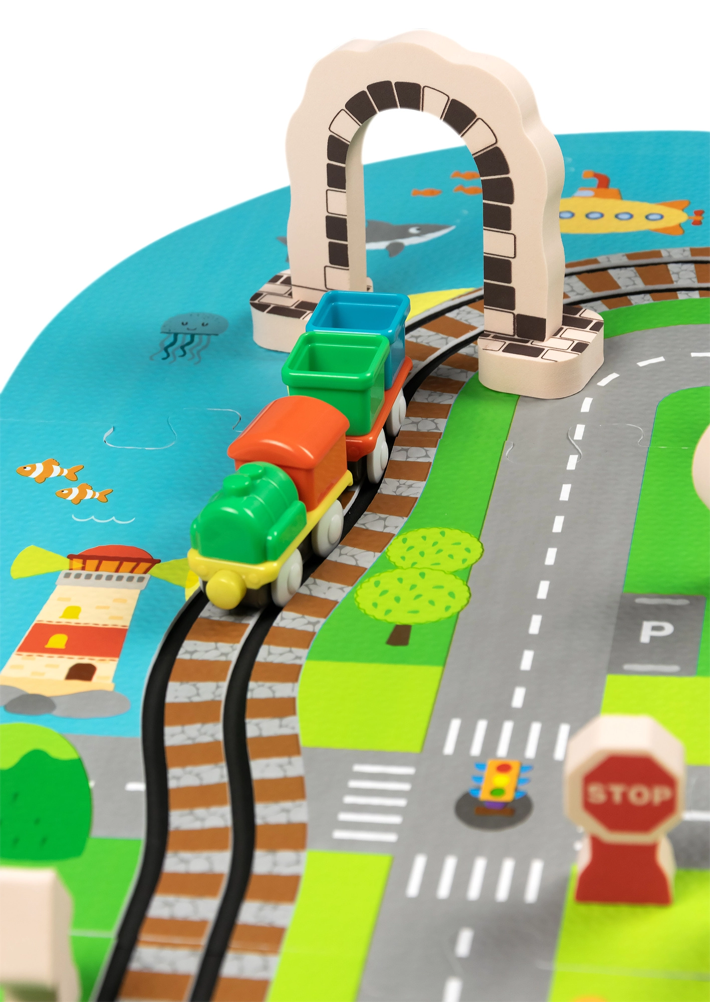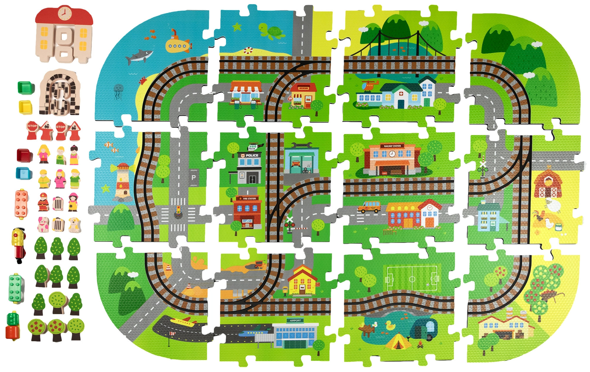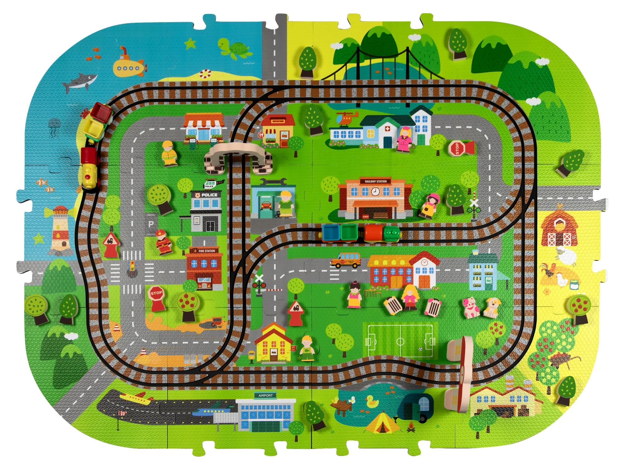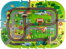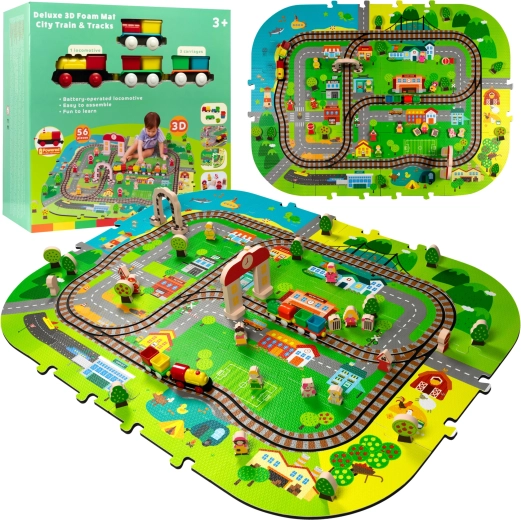 Този креативен комплект комбинира мека подова постелка с 3D град и железопътно трасе. Децата изграждат пъстра сцена с улички, сгради, летище, ферма, море, къмпинг и планини и оставят локомотива на батерии да се движи плавно по сглобената линия. Здравите EVA пяна елементи омекотяват ударите, изолират от студ и създават безопасно място за игра.