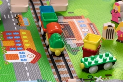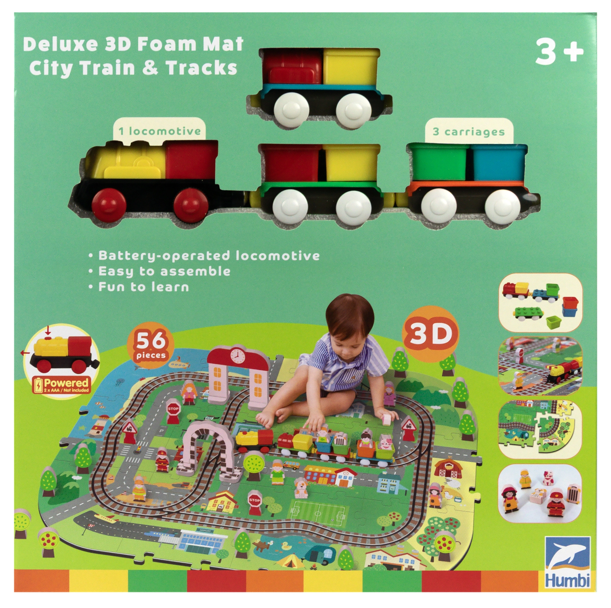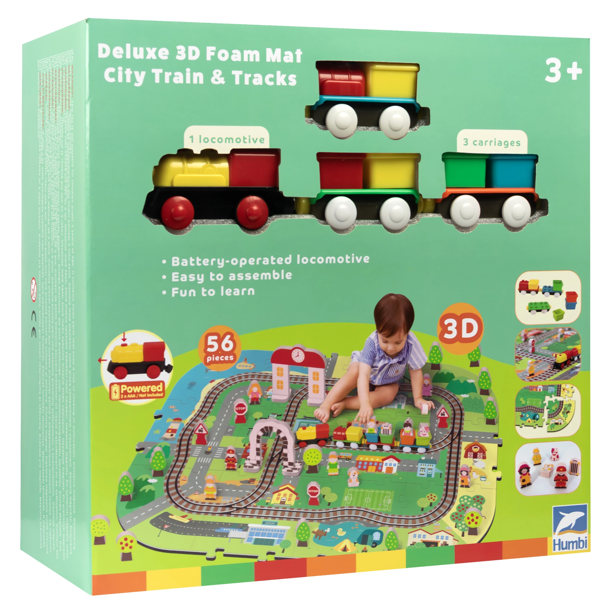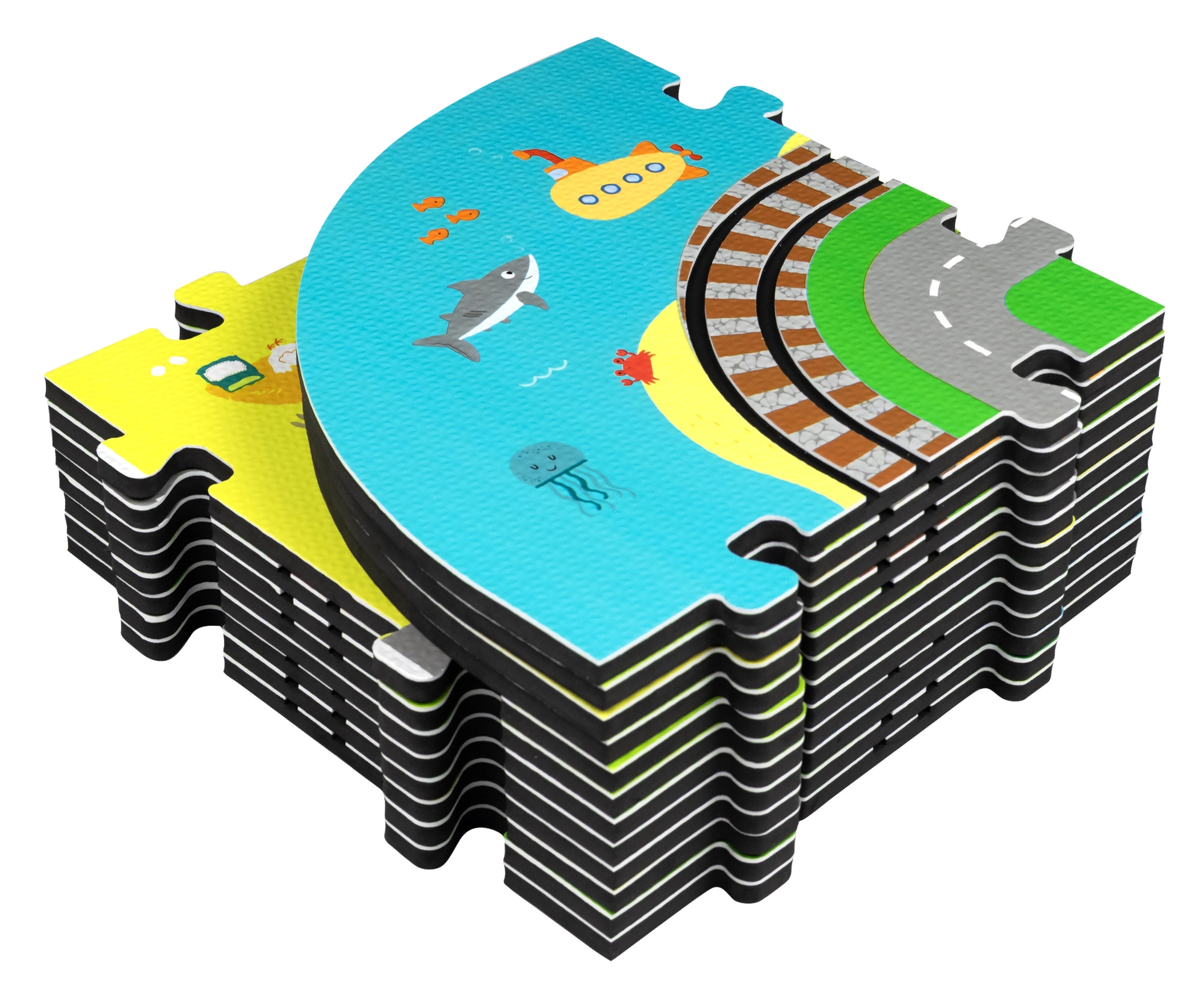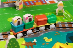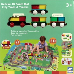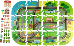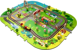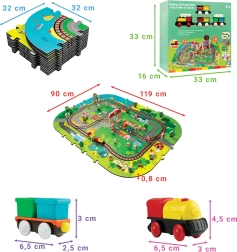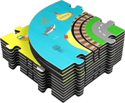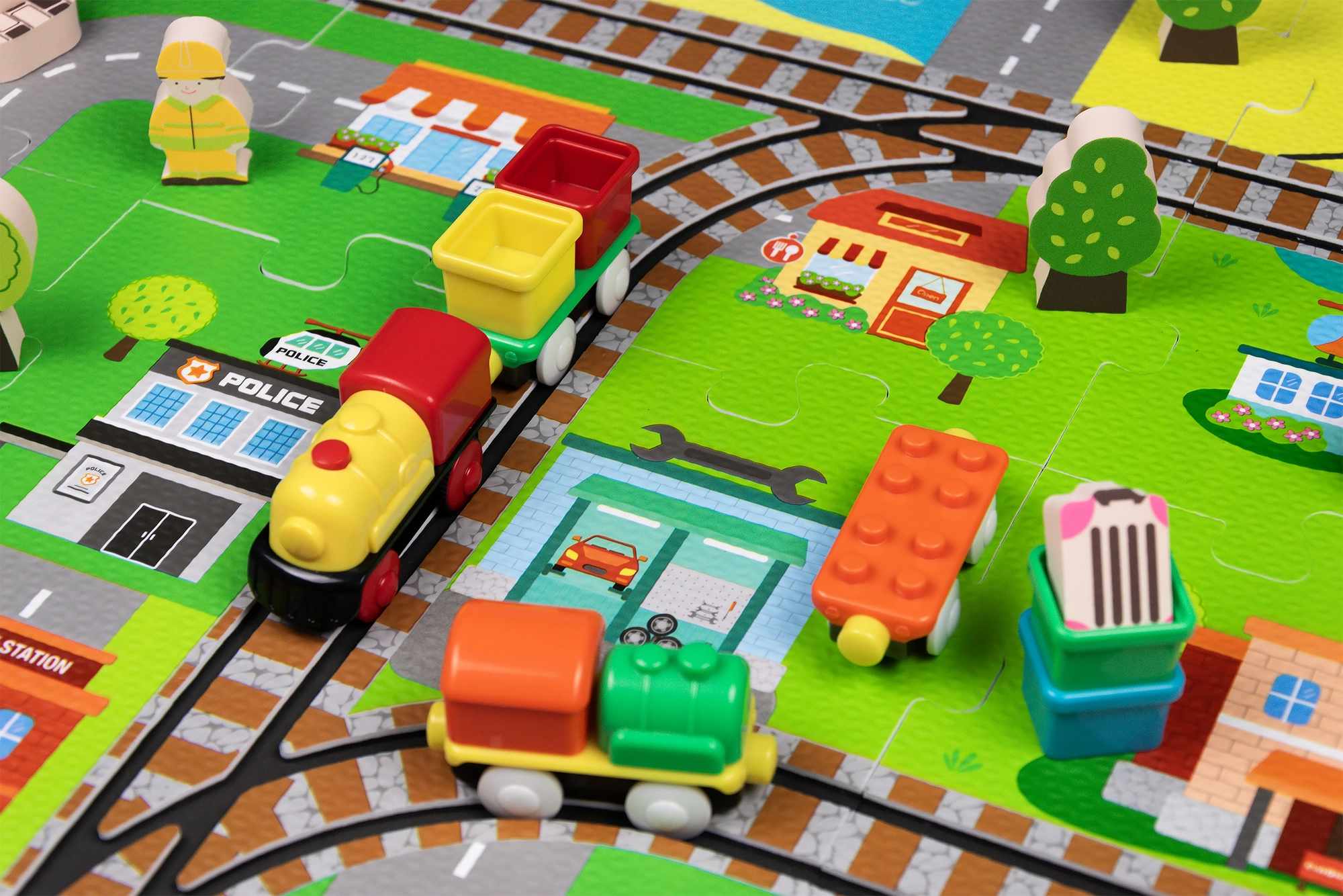 Този креативен комплект комбинира мека подова постелка с 3D град и железопътно трасе. Децата изграждат пъстра сцена с улички, сгради, летище, ферма, море, къмпинг и планини и оставят локомотива на батерии да се движи плавно по сглобената линия. Здравите EVA пяна елементи омекотяват ударите, изолират от студ и създават безопасно място за игра.
