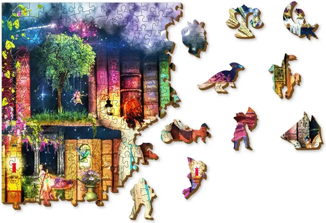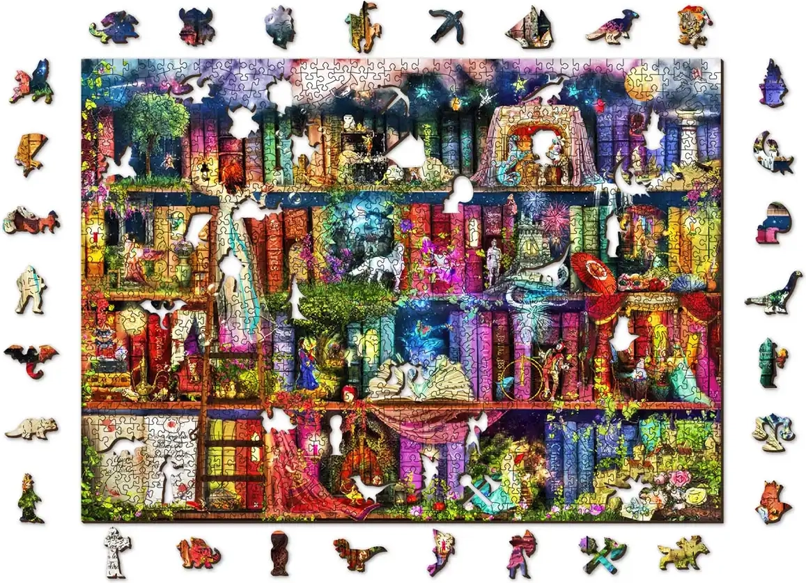 Потопете се в света на фантазията с дървения пъзел WOODEN CITY – Библиотека на съкровищата. Живи цветове, оригинална илюстрация и прецизна изработка гарантират приятно подреждане и красив завършен образ с размер около 51,9 × 37,5 cm. Благодарение на изключителните форми на елементите всяко сглобяване е забавно предизвикателство.