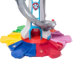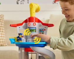 Иконичната база от PAW PATROL носи на децата безкрайни възможности за игра. След избор на мисия от панела с бутони и ефекти, просто издигнете Чейс с асансьора нагоре, огледайте се с въртящия се перископ и започнете героичната спасителна акция по широката пързалка директно към въртящата се изстрелваща рампа.