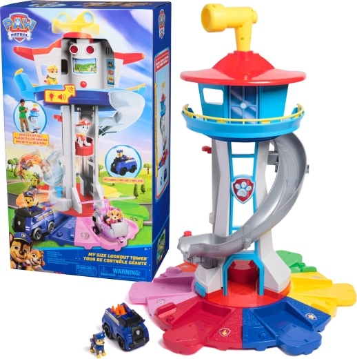 Преживейте екшън като във филма с повече от 81 см висока кула My Size Lookout Tower от PAW PATROL. Децата ще бъдат очаровани от светлинните и звукови ефекти, асансьора, въртящия се перископ и дългата пързалка към изстрелвача. В комплекта има фигурка на Чейс и неговото полицейско превозно средство – готово за действие веднага след разопаковане.