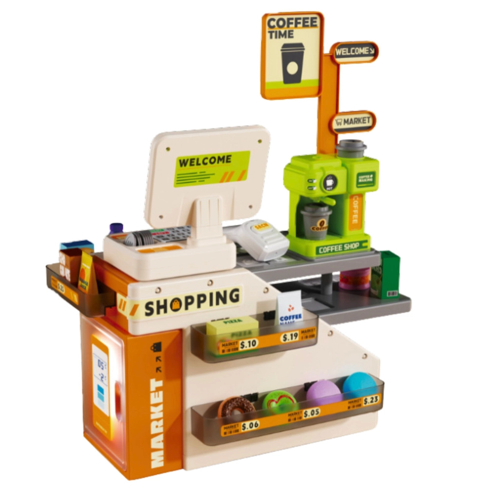 Пъстроцветна детска каса с вградено кафене, която предлага пълно работно място за малкия продавач. Включва функционален скенер, голяма кафе машина с вода, отворяем тезгях и хладилник, както и богато оборудване. Реалистичните светлинни и звукови ефекти стимулират фантазията, развиват сметни умения, координация и ролева игра.