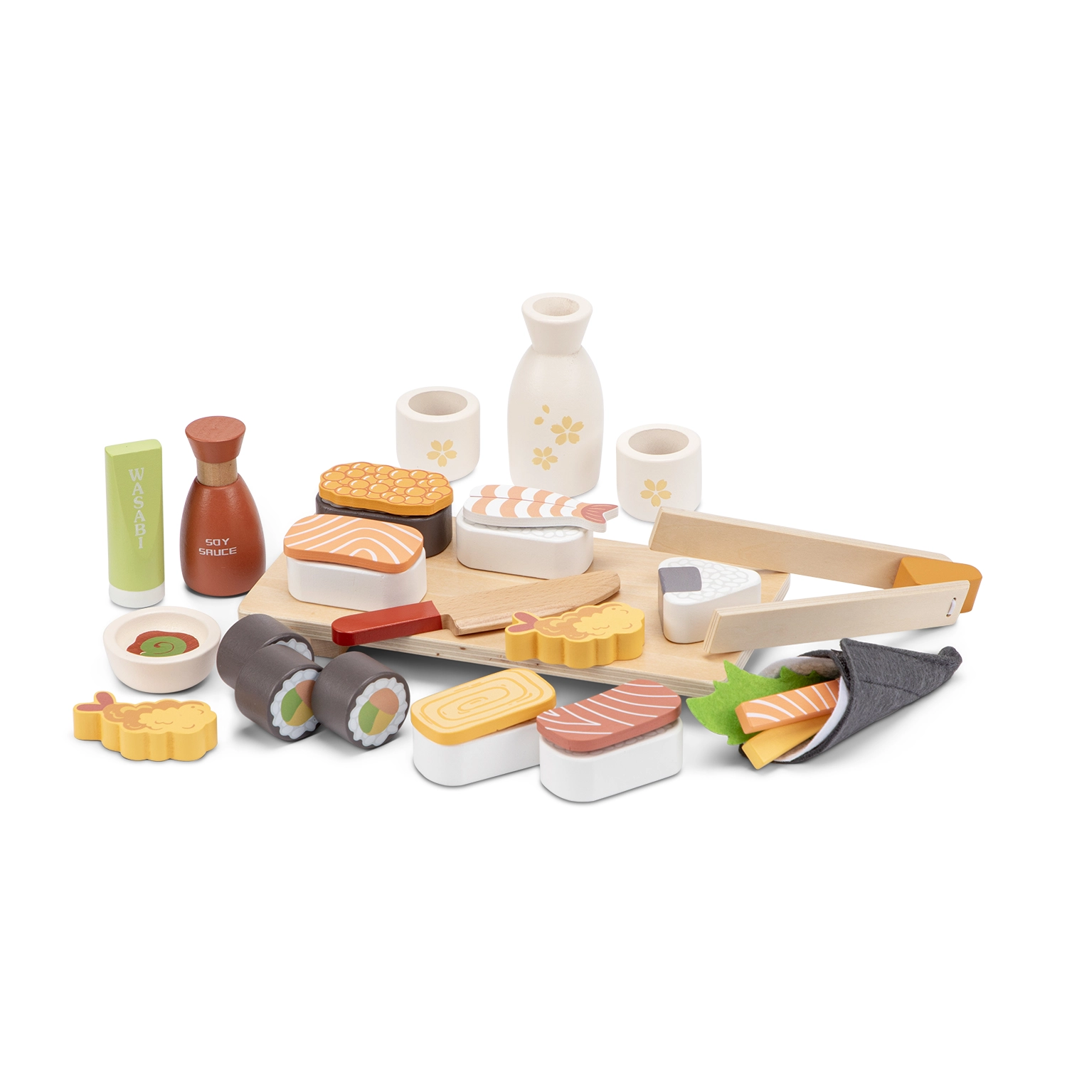 Този богато оборудван комплект позволява на децата да приготвят собствен „пир“ – от нигири и рулца до уасаби и соев сос. Включени са поднос за сервиране, клечки с детски захват, нож, купичка, щипки/клечки и дори бутилка със саке с чашки. Всеки елемент е детайлно изрисуван за реалистично усещане.