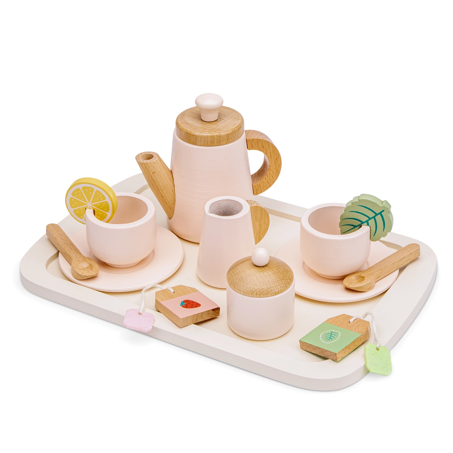 Поканете плюшените играчки и приятелите на стилно чаено парти с красив дървен комплект за деца от 2 години. Сетът включва чайник с капак, 2 чашки с чинийки, каничка за мляко, захарница, лъжички, чаени торбички, резен лимон, листо мента и просторен поднос. Подпомага фината моторика, въображението и социалната игра, а благодарение на естественото дърво и нежните цветове чудесно се вписва в детската стая.