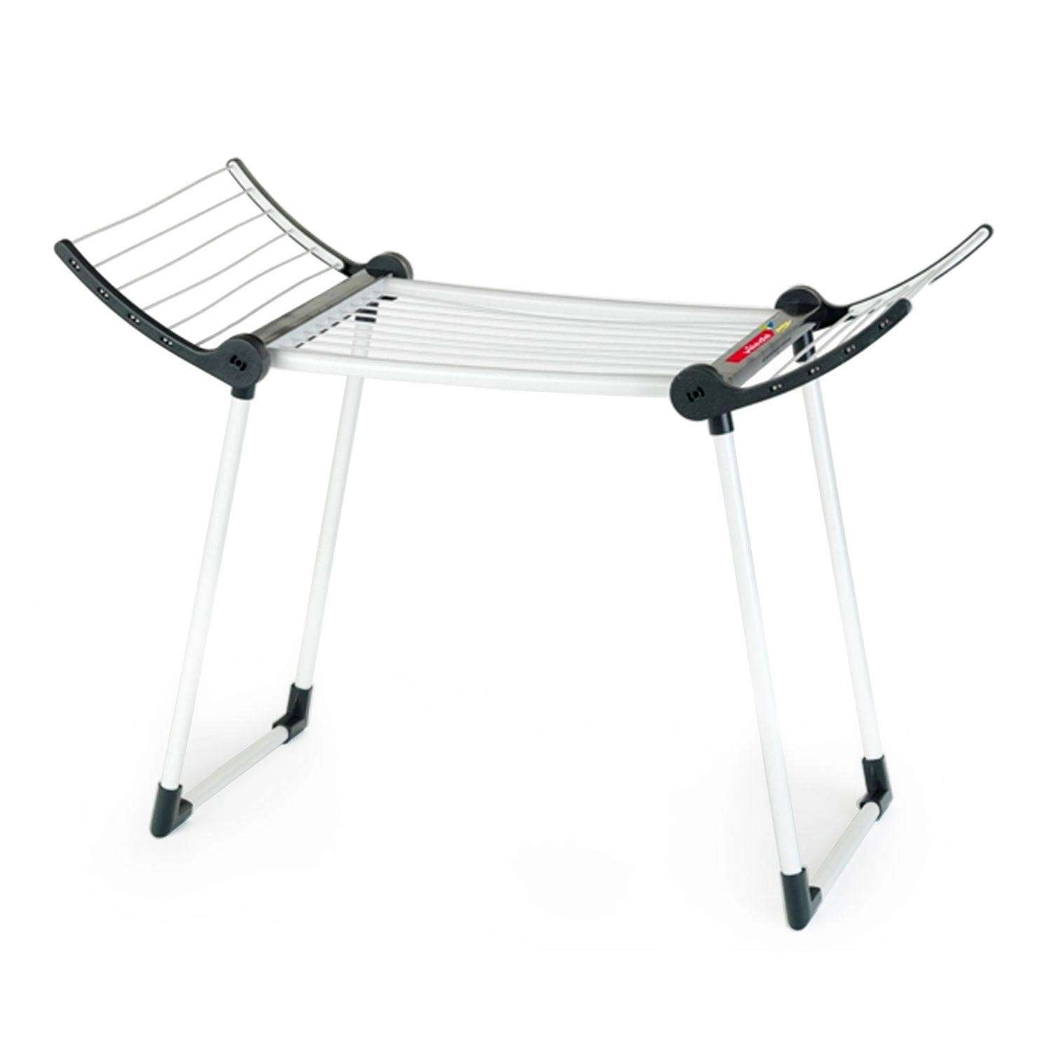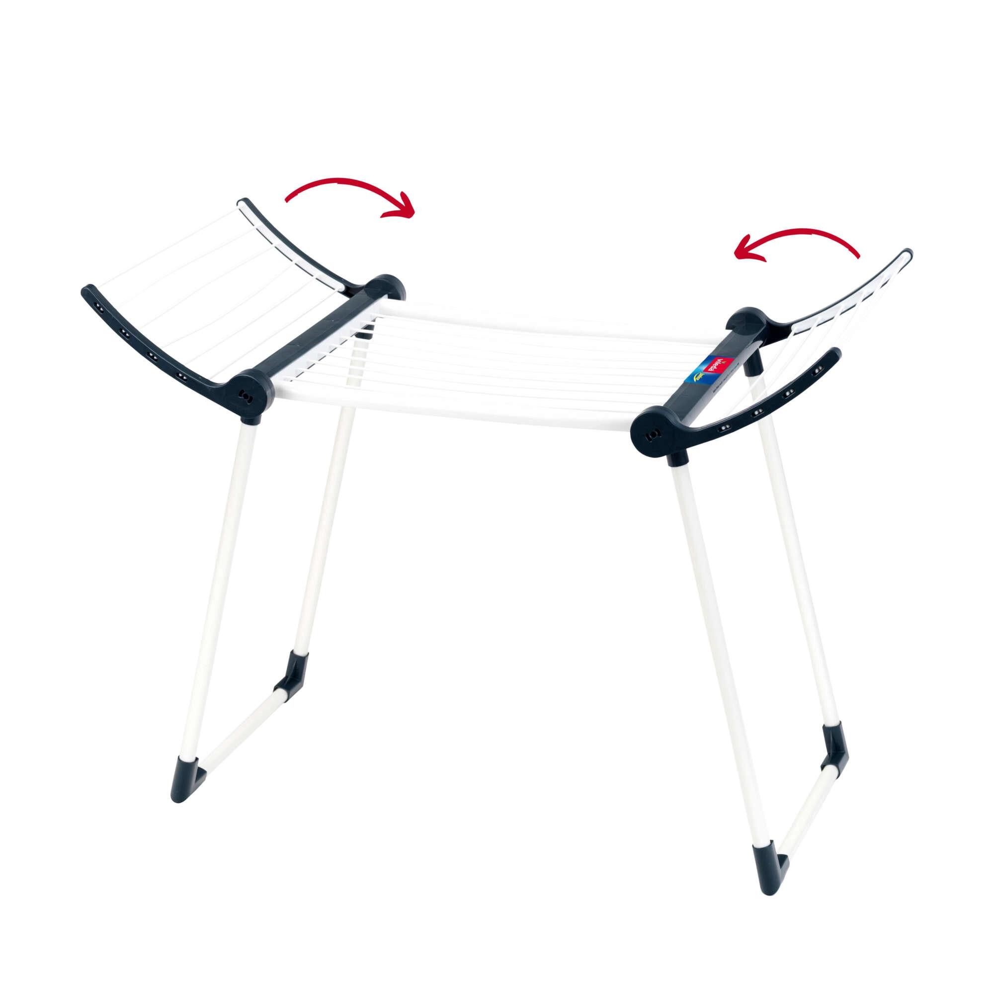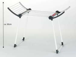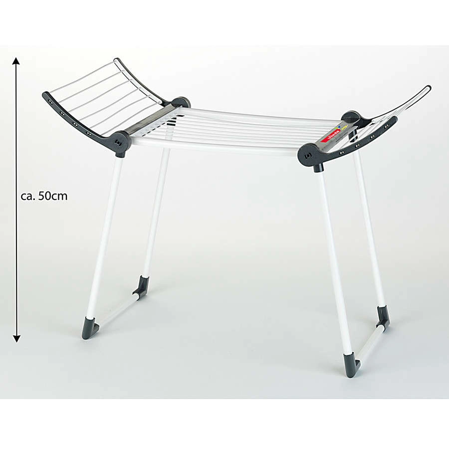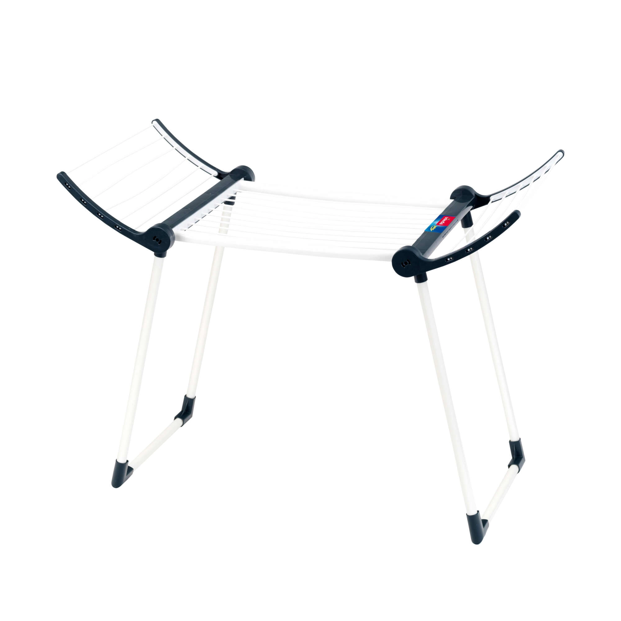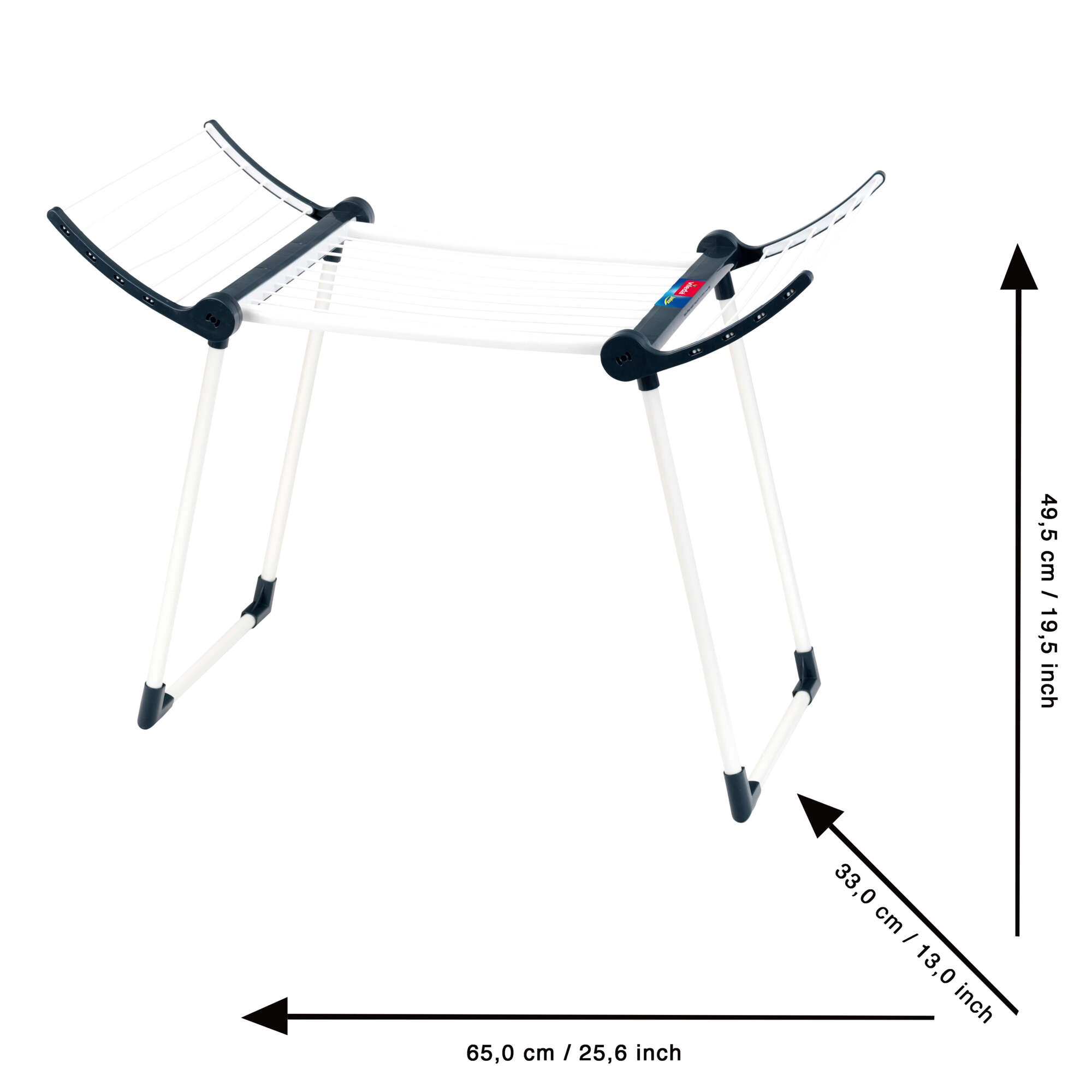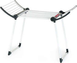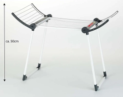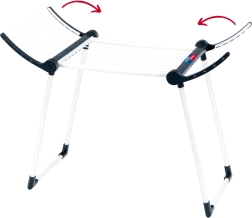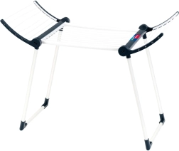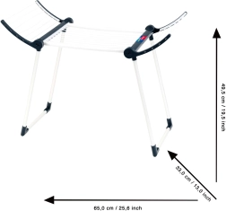 Конструкцията е здрава и стабилна благодарение на двойните крака, сушилката е в бял цвят с черни елементи и има две сгъваеми крила за повече площ за сушене. След игра лесно се сгъва до компактни размери, така че пести място в детската стая.