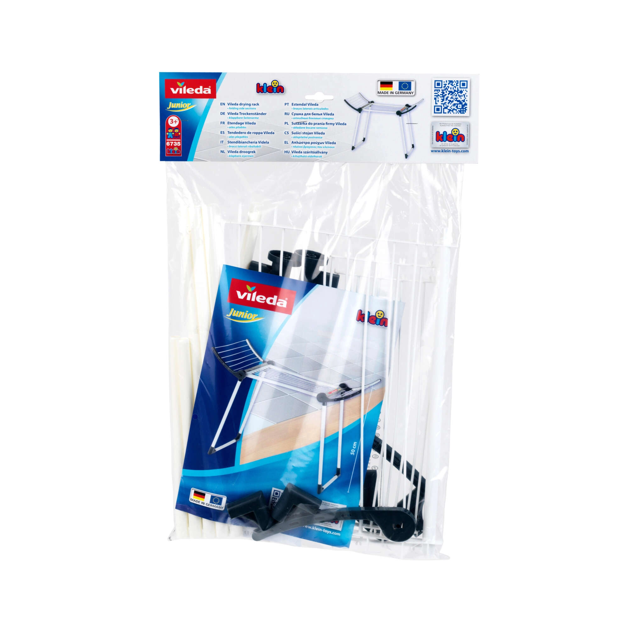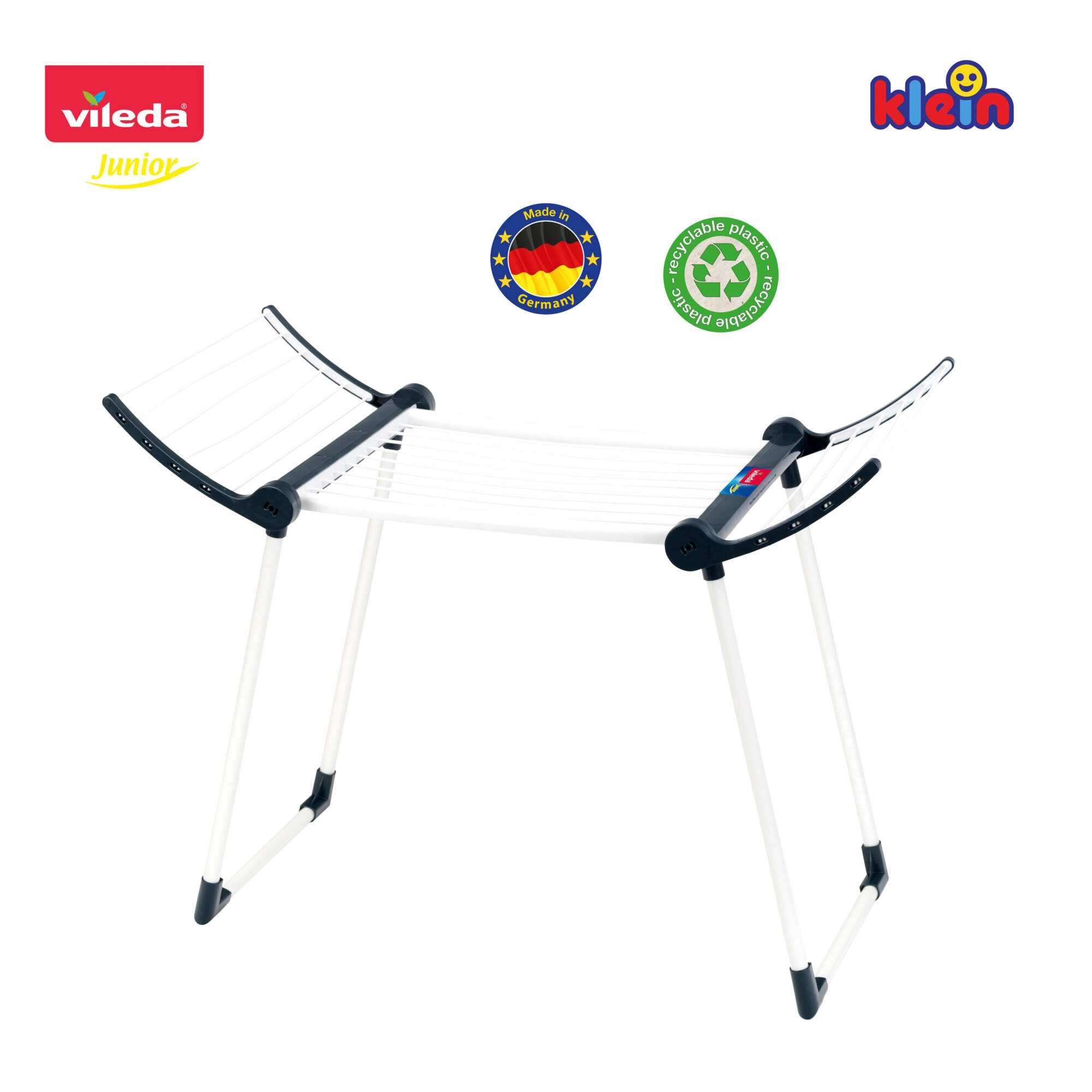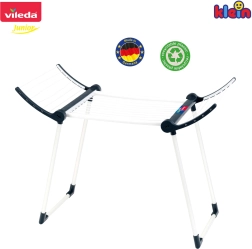 Реалистичната детска сушилка за пране Vileda от марката KLEIN е вярно копие на истинска сушилка и предлага на децата безопасно и забавно наподобяване на домашни дейности. Изработена е с внимание към детайла, има стабилни двойни крака, две сгъваеми крила и ниско тегло. Благодарение на възможността за сгъване до по-малки размери не заема място, когато не се използва.