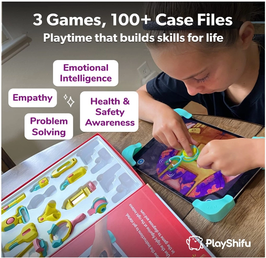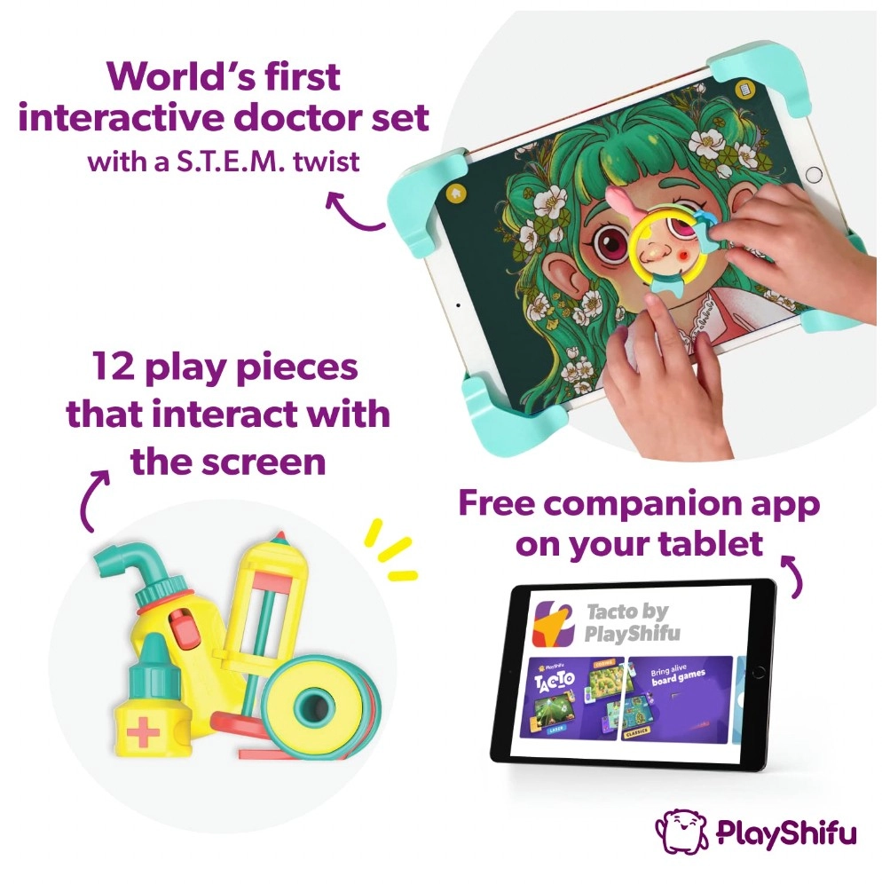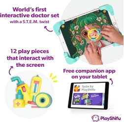 Превърнете таблета в детски кабинет с интерактивната игра ДОКТОР! Този умeн комплект за деца на 4–8 години комбинира истински лекарски инструменти с приложение и подпомага фината моторика, креативността и логическото мислене. Сетът съдържа 12 реалистични инструмента, практичен куфар и ъгли за закрепване на таблета – таблетът не е включен в комплекта.