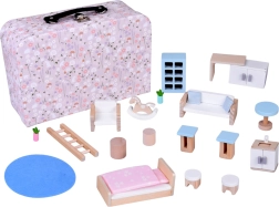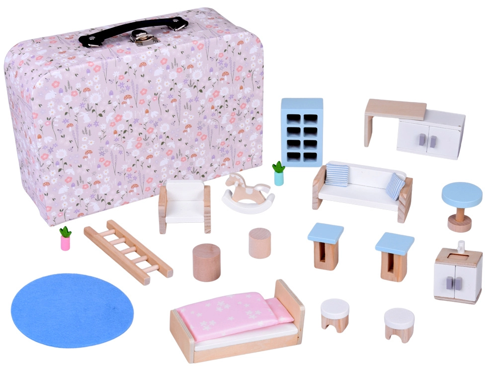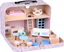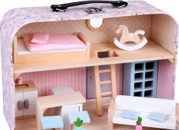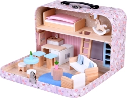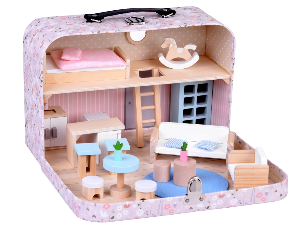 Очарователна двуетажна къщичка за кукли, скрита в цветно куфарче, съчетава игра и практично съхранение. Отварящото се куфарче служи като игрова къща и едновременно като кутия за съхранение. Включва множество дървени мебели в нежни пастелни цветове – легло с завивка, канапе, кресло, маса, помощни масички, шкафчета, рафтчета, столчета, килимче и конче на пръчка. Благодарение на дръжката комплектът е лесен за пренасяне, компактен и идеален за креативна игра и развитие на въображението у дома и по време на път.