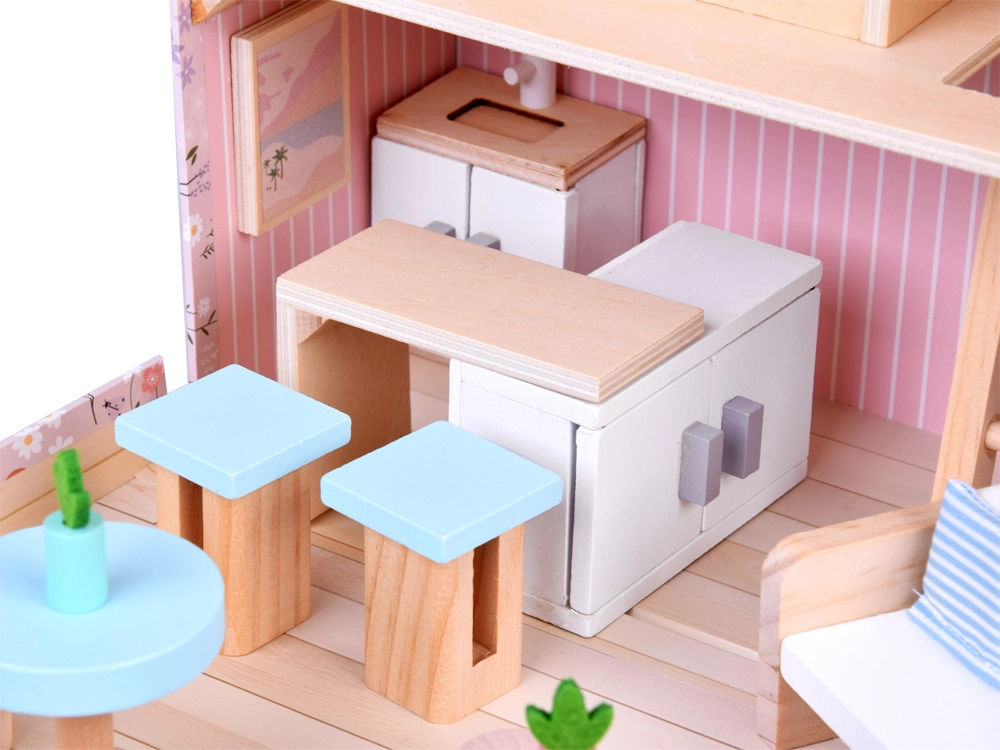 Отворете цветното куфарче и влезте в уютната двуетажна къщичка. Горе ви очаква спалня с легло и завивка, огледало и ретро люлеещо се конче, а долу – отворен дневен тракт с кухненски кът – идеален за следобеден чай, съвместно готвене и отдих. Всички елементи са от гладко дърво с издръжливо покритие, проектирани за малки детски ръчички.