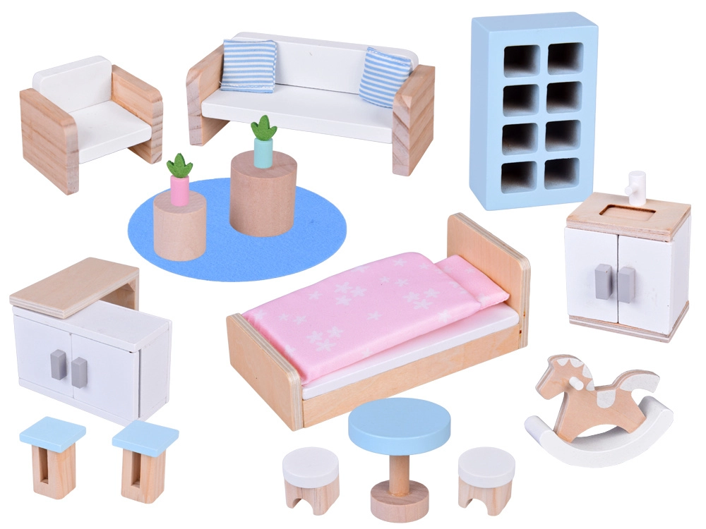 - Куфарче с дръжка, легло, завивка и възглавница, люлеещо се конче, стълба, шкаф, шкаф с мивка, работен плот, 2× табуретка, стенна картинка, рафт с полици, малка масичка, 2× столче, канапе, 2× възглавничка „помпон“, кресло, килимче, холна маса, пуф, 2× растение в саксия