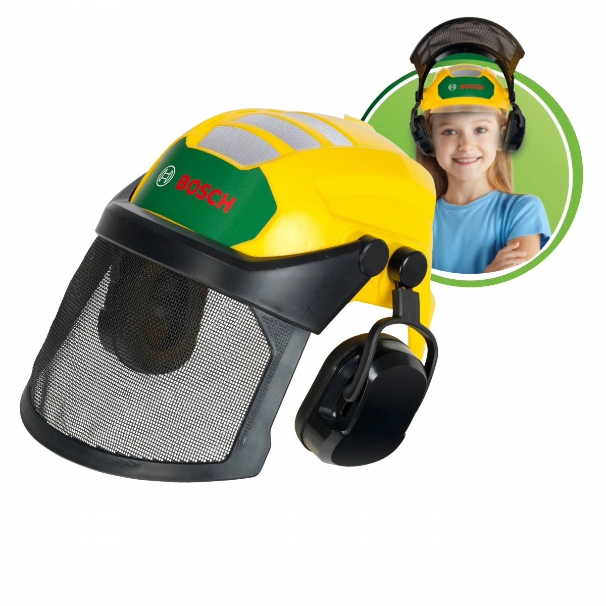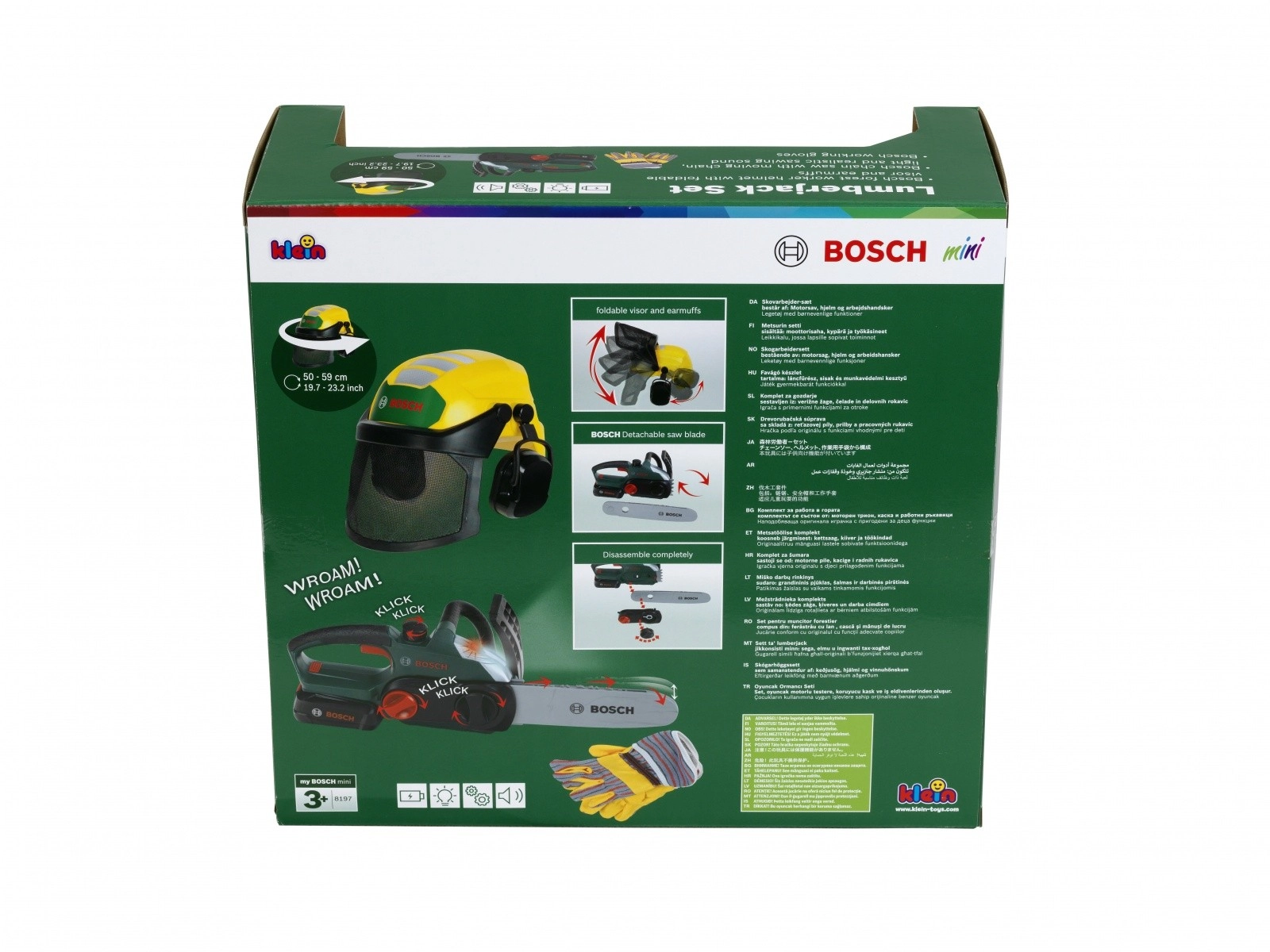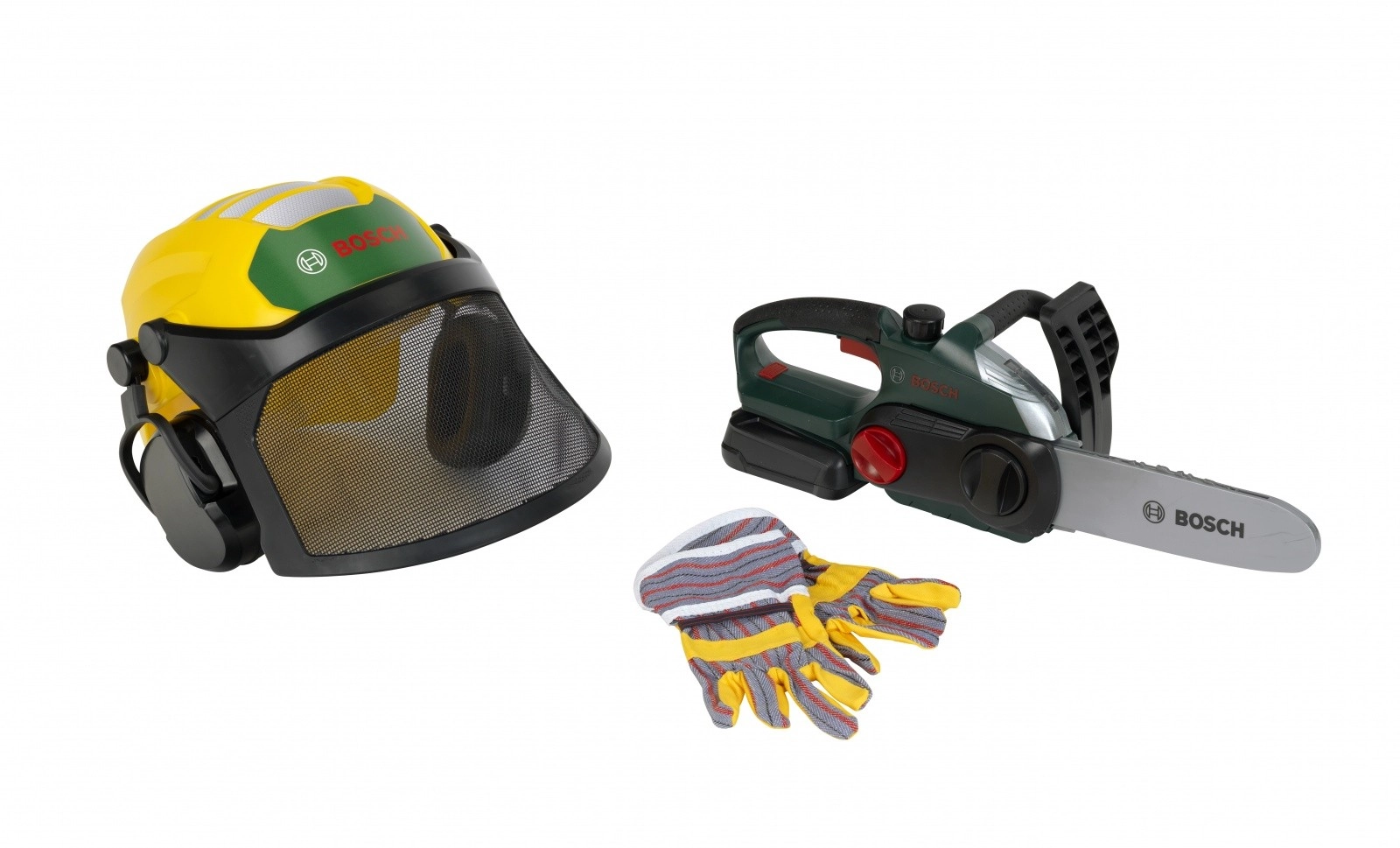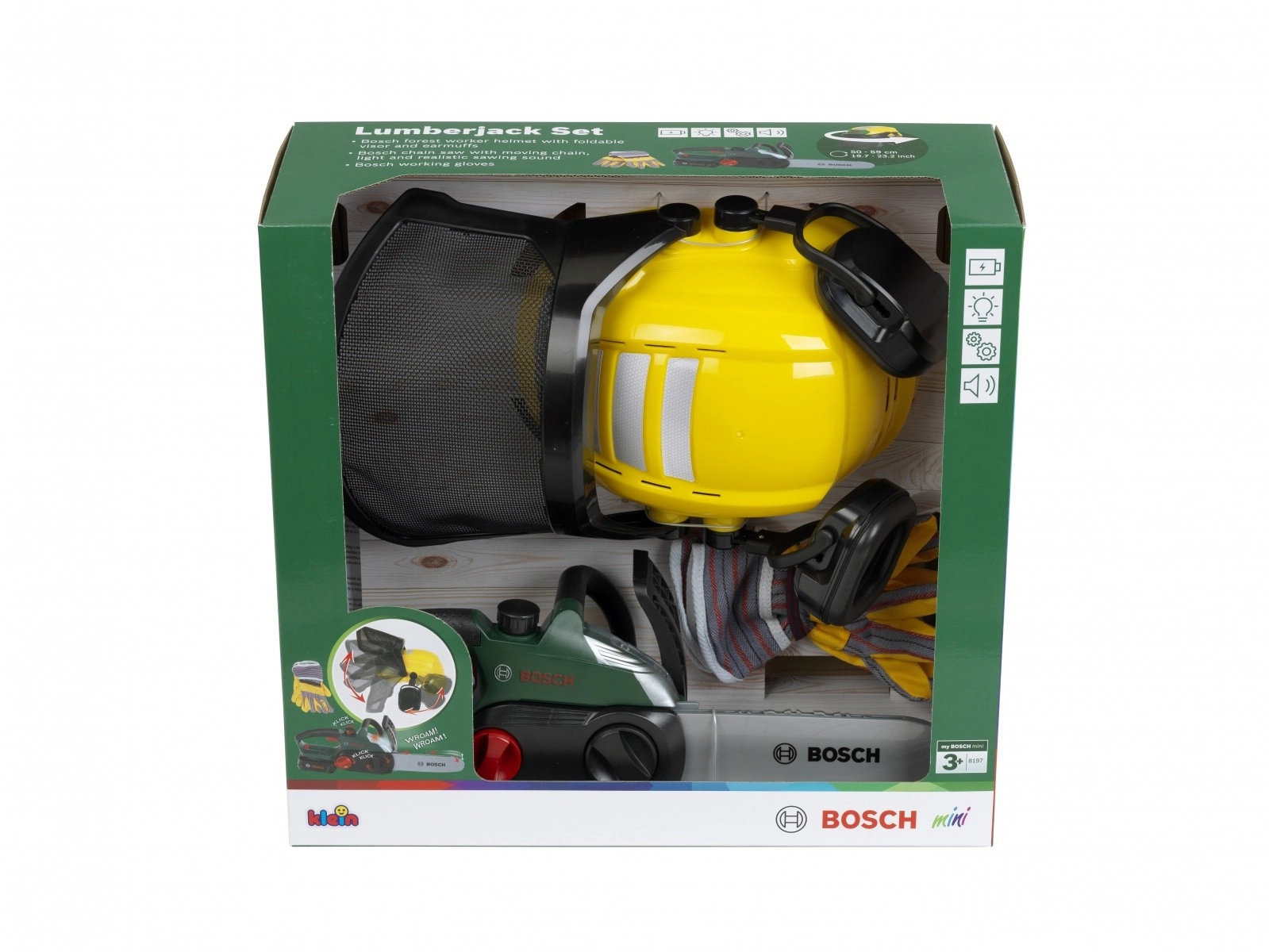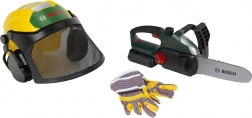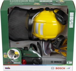 Детският комплект дървосекач BOSCH е проектиран за безопасна и стимулираща игра. Електронният моторен трион след поставяне на шината издава автентичен звук на рязане и съпътстваща мигаща светлина, които симулират работата на истински инструмент. Регулируемата каска с щит и интегрирани „слушалки“ добавя реализъм и учи децата на основите на безопасността.