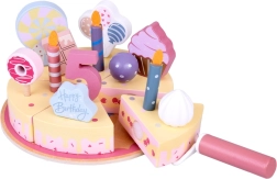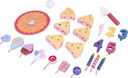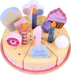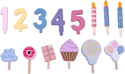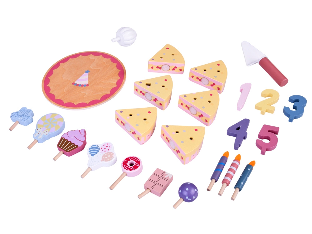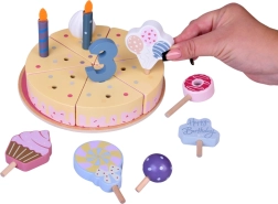 Подредете си собствено рожденденско парти! Дървената торта се състои от 6 парчета, които могат да се „отрежат“ и отново да се съединят, и да се украсят със сменяеми свещички, цифри и сладкиши. Комплектът е идеален за съвместна игра, учене на цветове, броене и упражняване на учтиво сервиране.