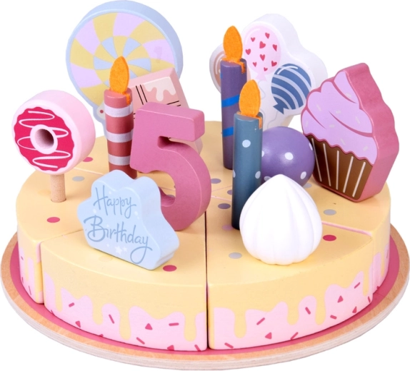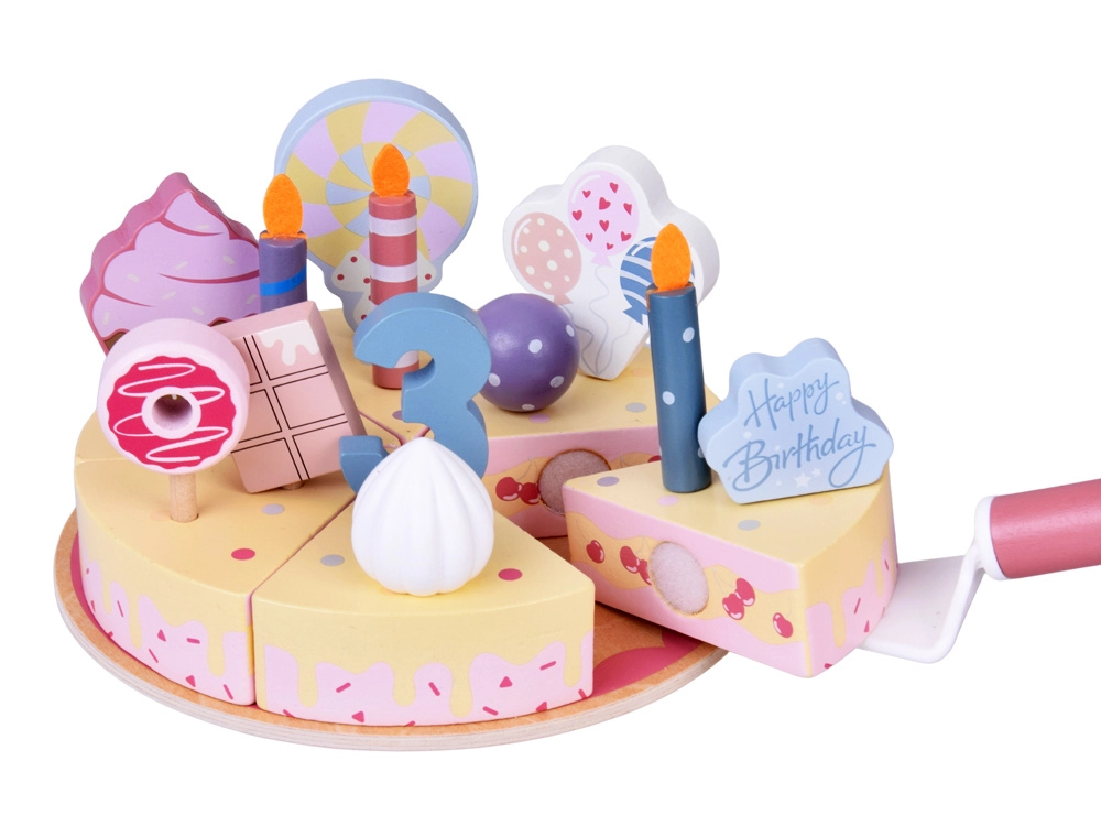Очарователната дървена рожденденска торта за рязане превръща всяка игра в празник. Децата ще се забавляват с креативно украсяване, рязане на парчета и поднасяне. Гладко шлифовано дърво, нетоксични бои и пъстри аксесоари (свещички, цифри 1–5, сладкиши, надпис Happy Birthday) развиват фината моторика, въображението и ролевите игри.