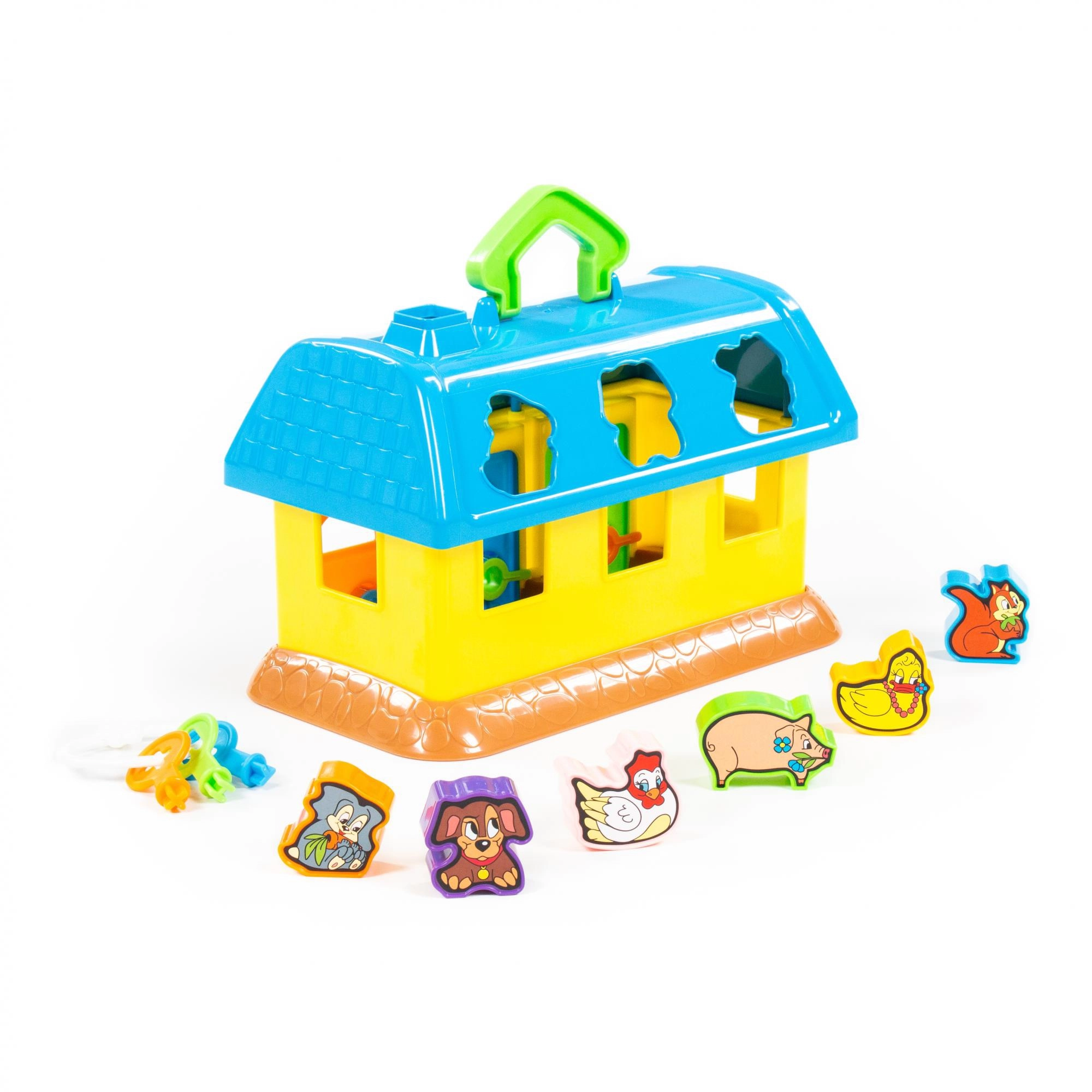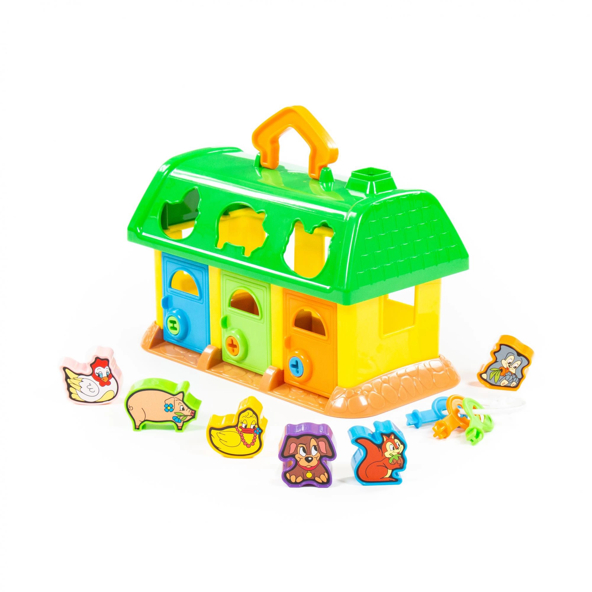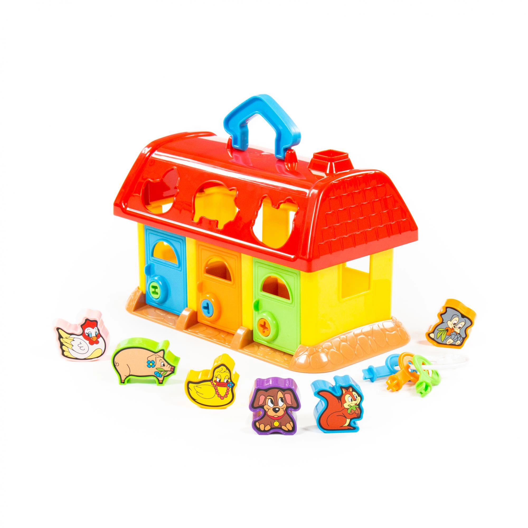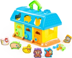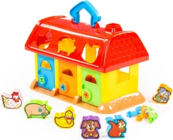 Тази цветна пластмасова къщичка е отличен избор за първи дидактични игри. Децата вмъкват животинските форми в съответните отвори на покрива и с помощта на ключовете отварят вратичките, за да извадят своите „съкровища“. Играчката естествено подпомага координацията око–ръка, търпението и пространственото въображение.