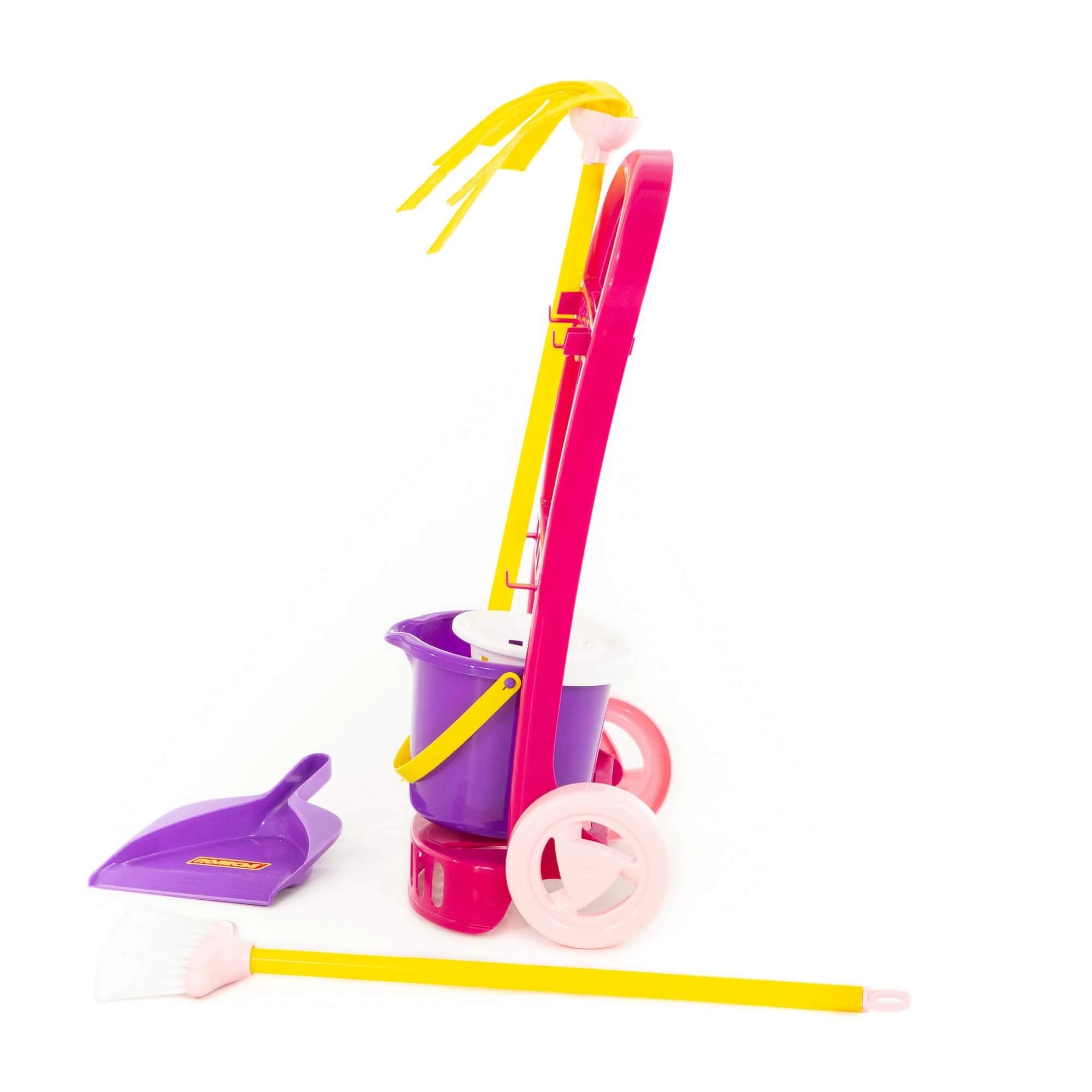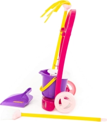 Включени са кофичка с изстисквачка, моп, метла и лопатка – всичко е пригодено за детски ръце и безопасна игра.
