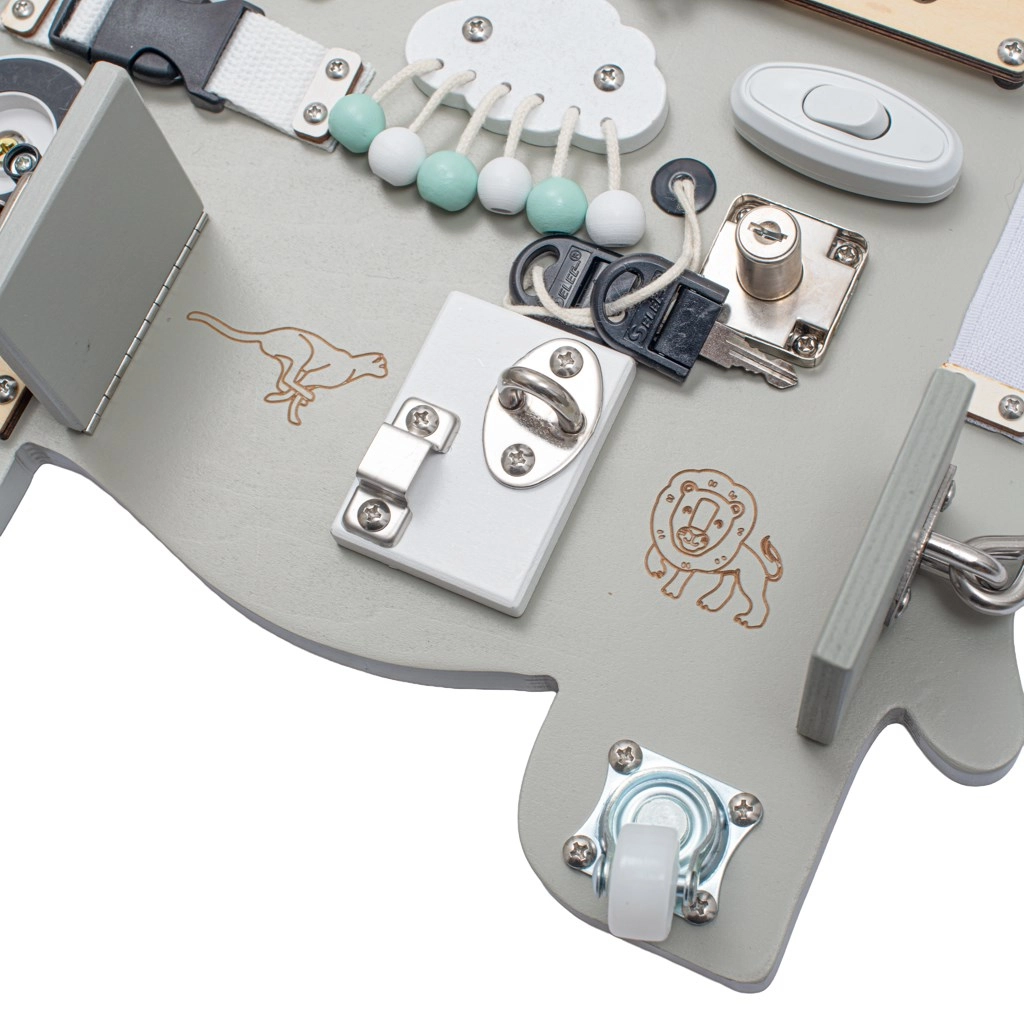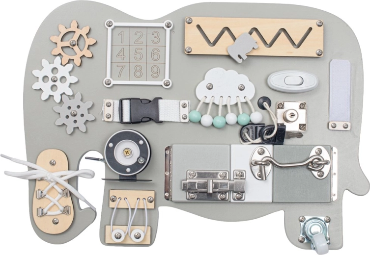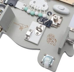 Тази образователна Montessori активна дъска предлага на децата реални стимули от ежедневието и ги мотивира към самостоятелно откриване. Елегантният дизайн със слон чудесно се вписва във всеки интериор, а благодарение на здравото дърво издържа и на интензивна употреба.