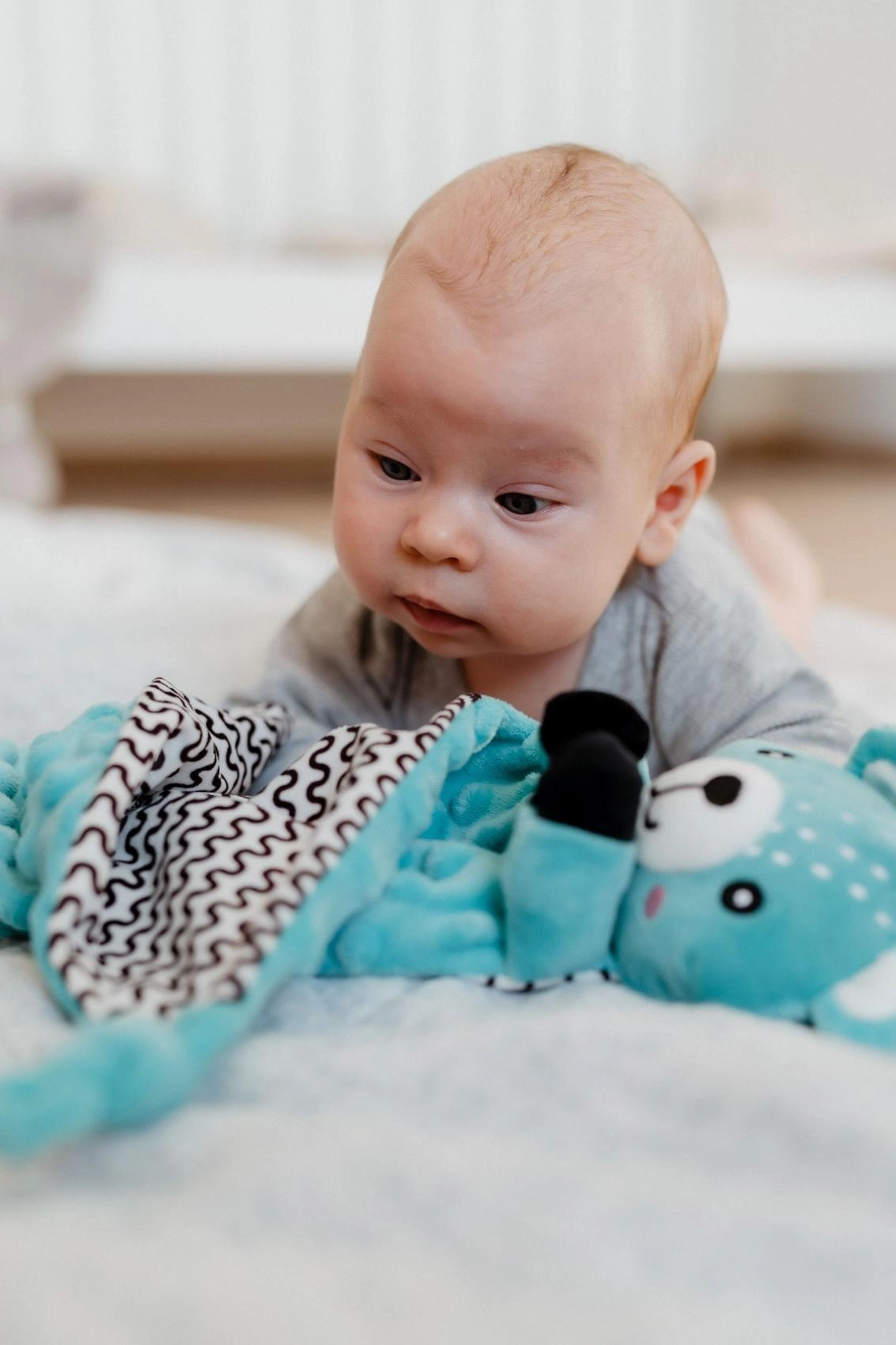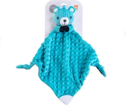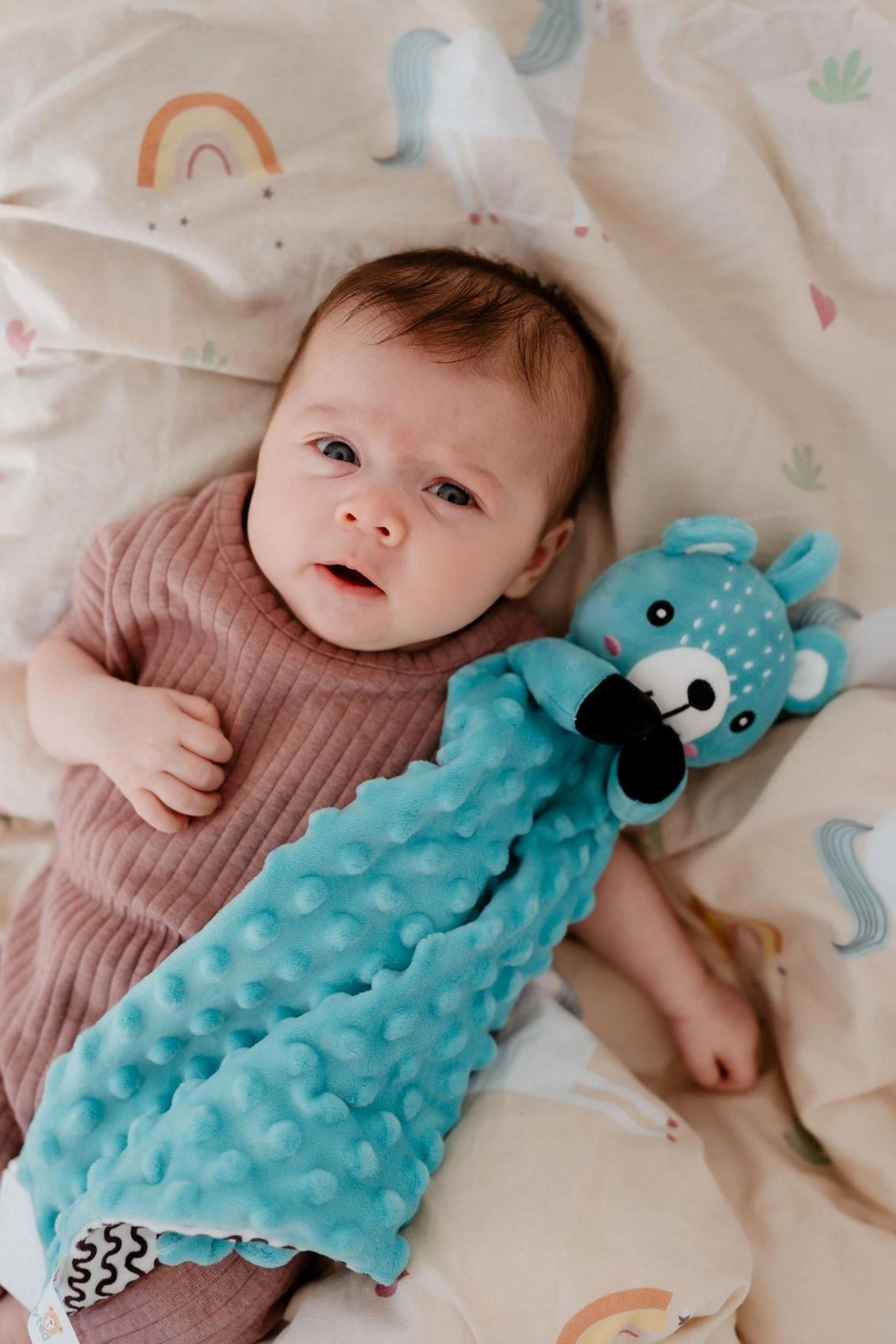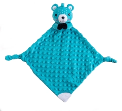 Меко одеялце за приспиване с глава на сладко мече от меко минки с 3D точици, което осигурява на бебето усещане за сигурност, успокояване при заспиване и нежна сетивна стимулация. Вътре в мечето има тиха дрънкалка за подпомагане на слуха, а в единия ъгъл – мека силиконова дъвкалка за облекчаване при никнене на зъбки.