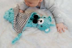 Едното рамо на одеялцето е допълнено с мека силиконова дъвкалка, която облекчава чувствителните венци. Възелчетата в ъглите се хващат лесно от малките ръчички и подпомагат развитието на фината моторика. Продуктът е сертифициран в ЧР и отговаря на стандартите за безопасност за новородени.