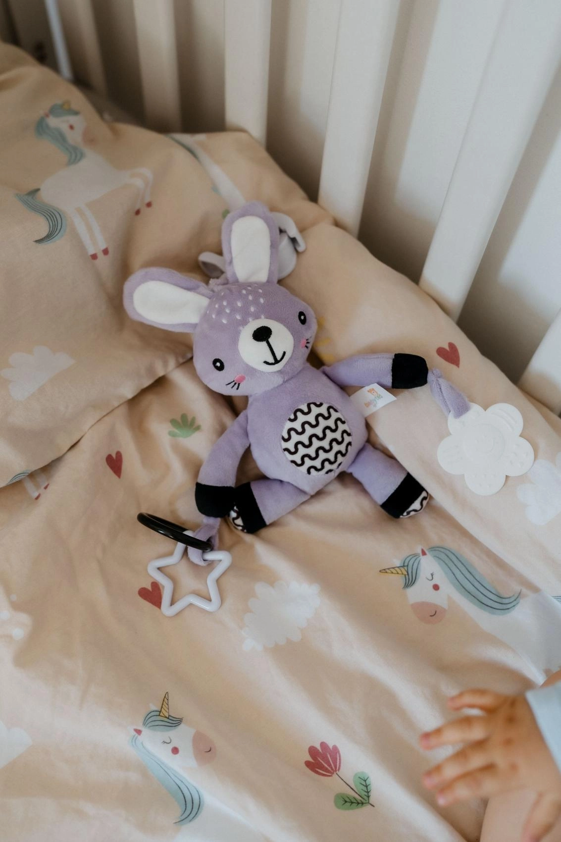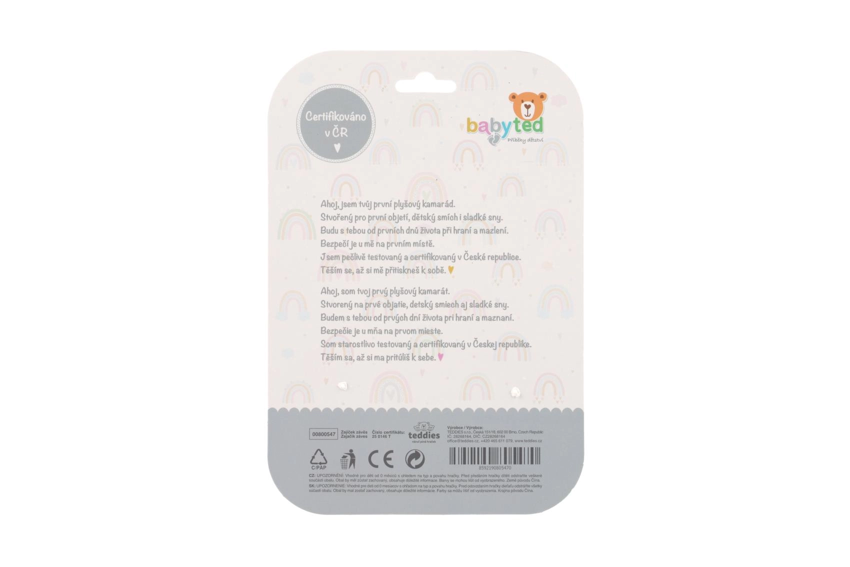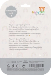 В края на лапичките ще откриете безопасни пластмасови форми – звездичка и цвете. Те служат като гризалки и помагат за упражняване на захвата и координацията на ръцете. Играчката е сертифицирана в ЧР и е подходяща за деца от раждането.