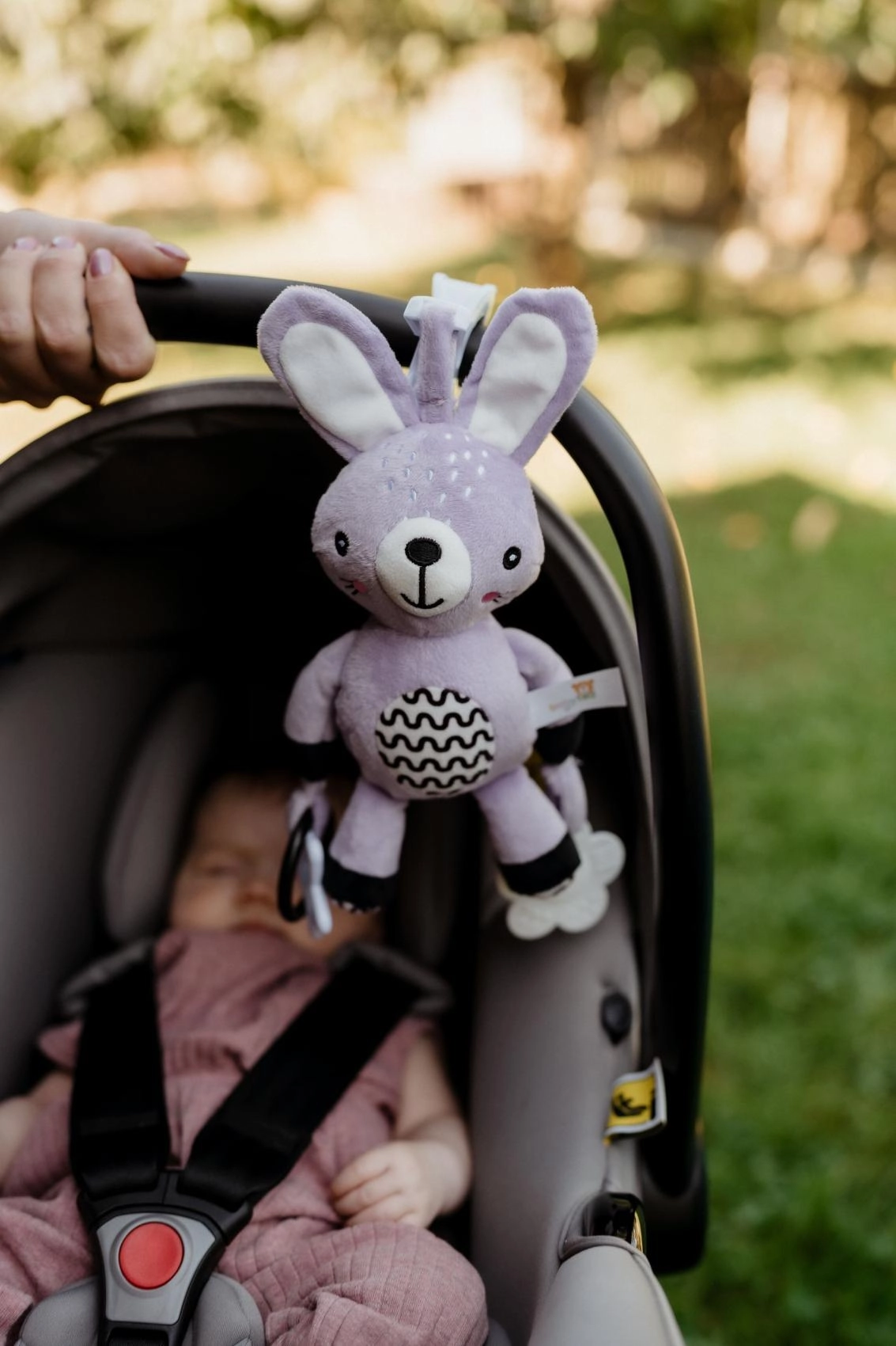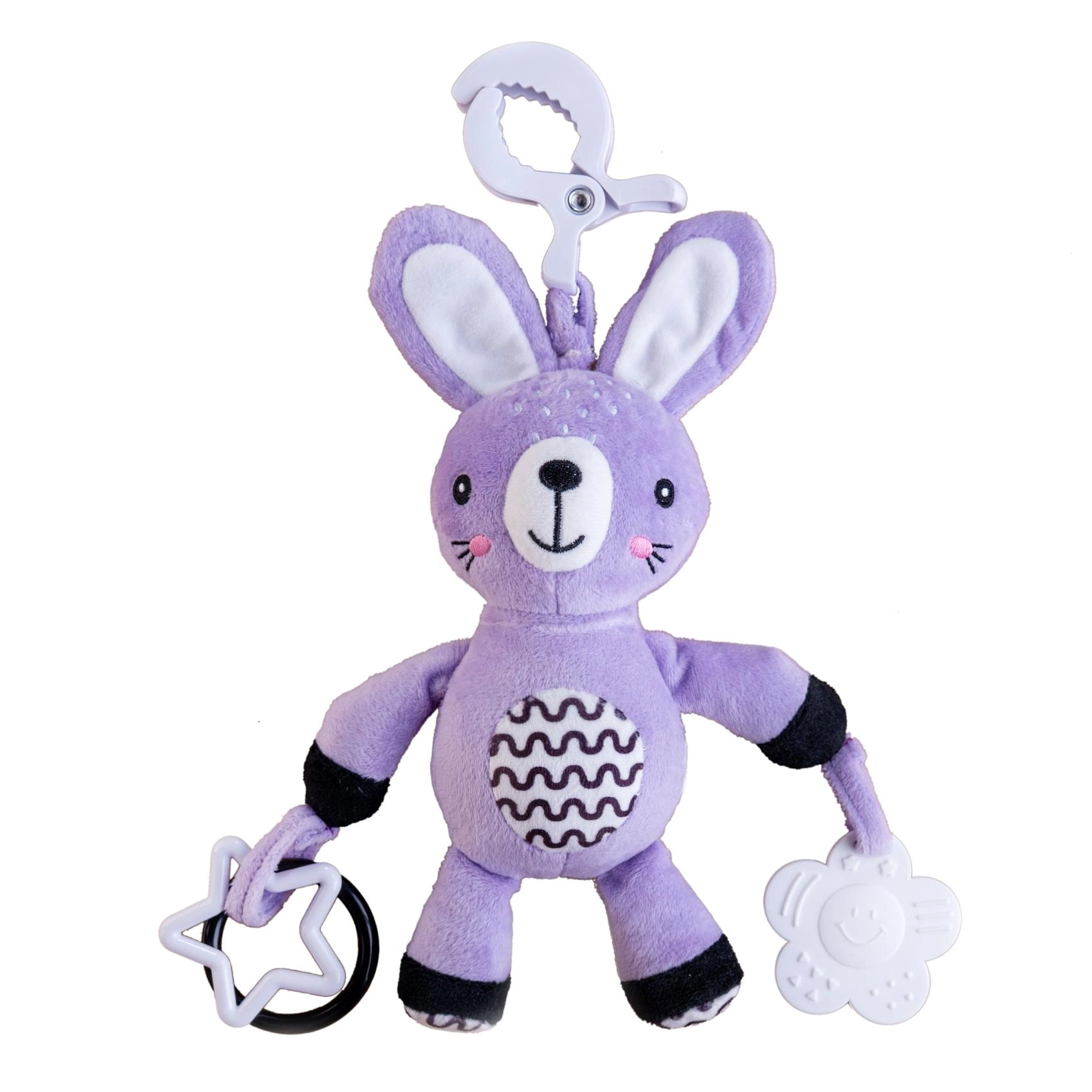 Практична щипка за бързо прикрепване към количка, столче за кола, кошара или гимнастика за бебе – забавление и успокоение винаги под ръка.