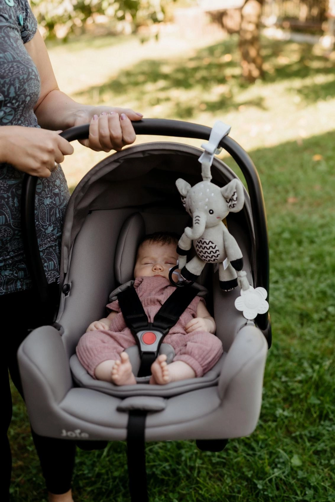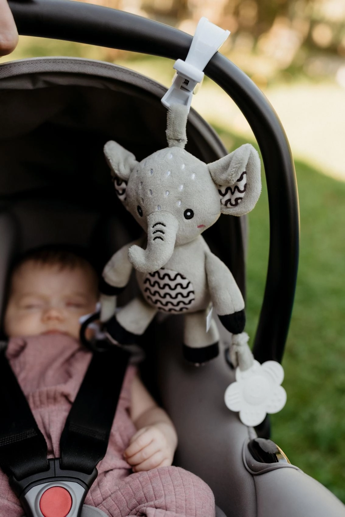 Само за миг закрепяте слончето към количка, кошче или дръжката на столчето за кола – идеално забавление за път и у дома.