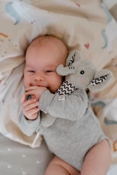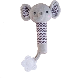 Плюшен слон с пискалка и гризалка е идеалната първа играчка за новородени. Благодарение на ергономичната, продълговата форма се държи лесно дори в мънички ръчички, нежното писукане стимулира слуха и привлича вниманието на бебето. Мекият, безопасен материал осигурява приятен допир и успокояващо усещане при гушкане.