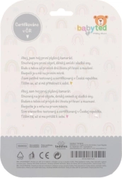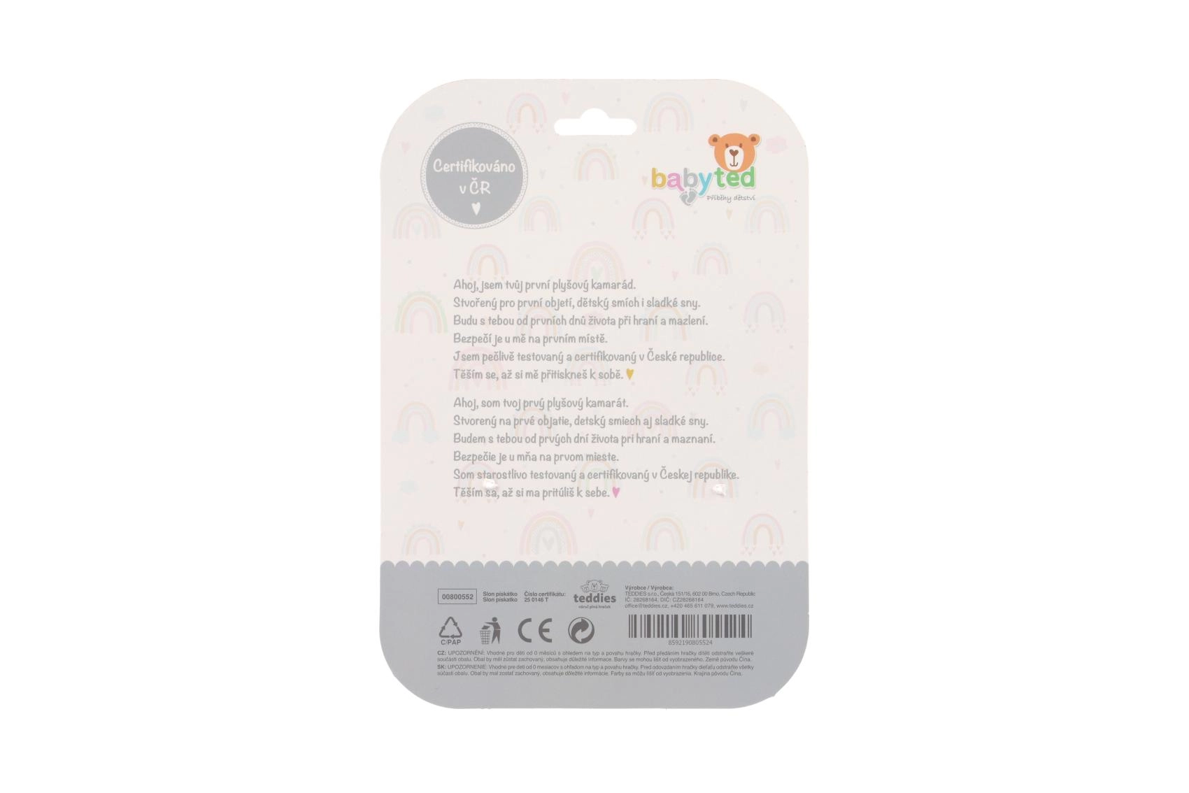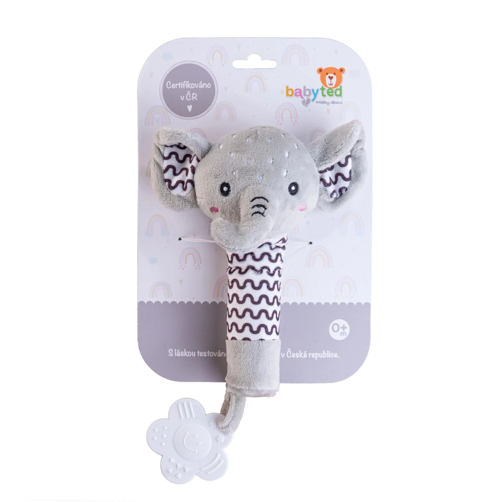 Очарователна плюшена пискалка и гризалка във форма на слон от марката BABYTED ще зарадва бебетата още от раждането. Има меко тяло за лесно държане, при натиск нежно писука, а в края на дръжката има мека гризалка във форма на цвете за облекчение на чувствителните венци. Контрастните десени подпомагат визуалното възприятие, а безопасната, мека плюш е щадяща към най-малките деца. Сертифицирано в ЧР според строги стандарти за безопасност.