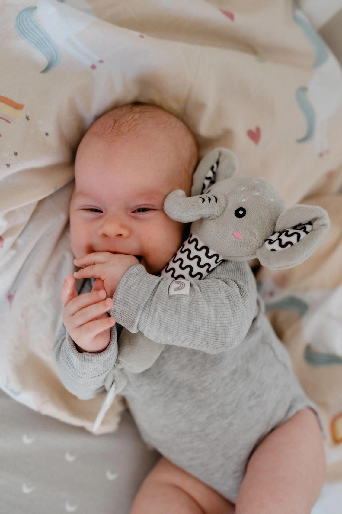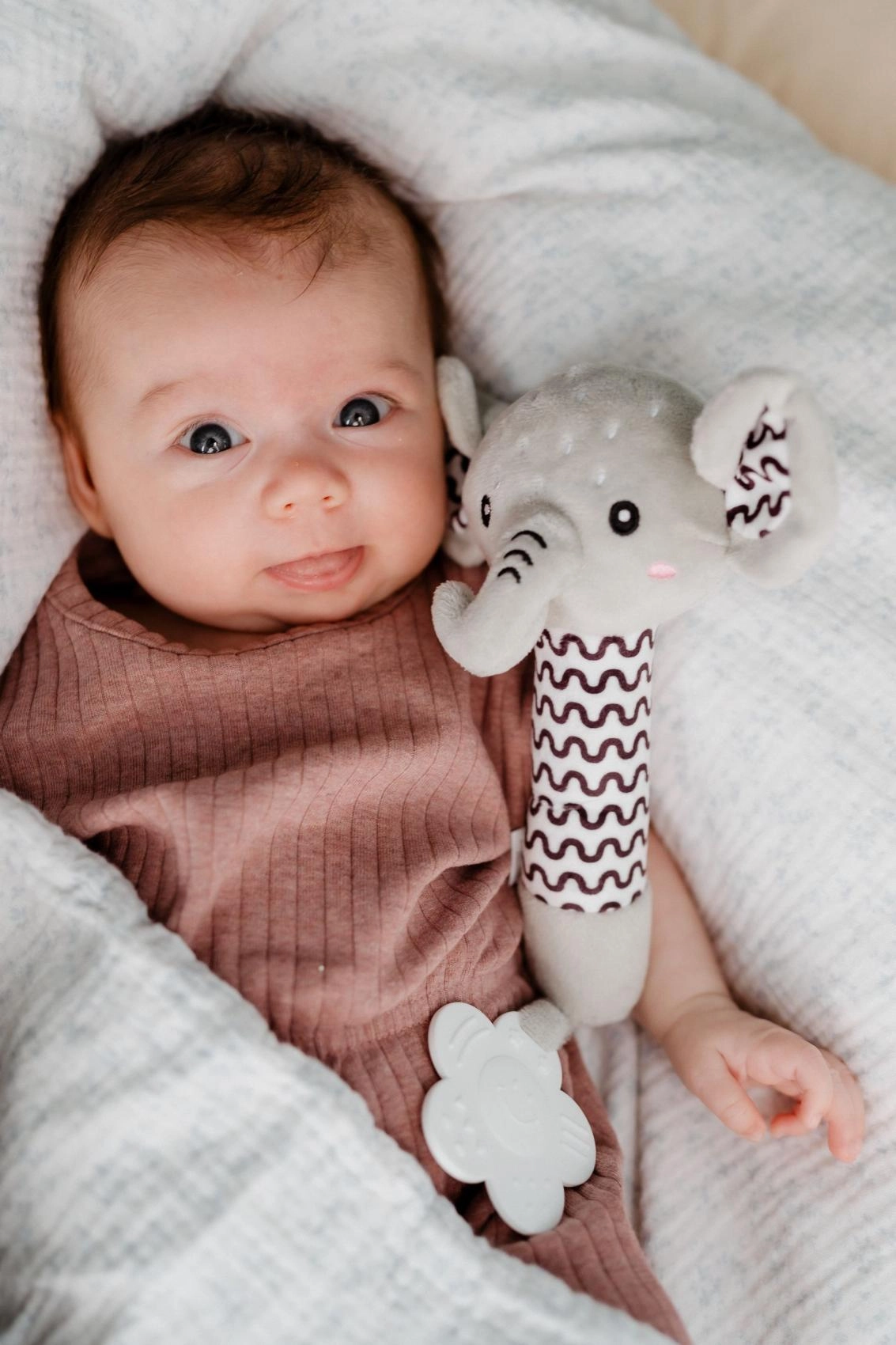 При натиск слончето нежно писука, подпомага слуховото възприятие и привлича вниманието на бебето без прекомерен шум.