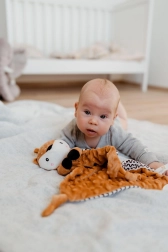 Това меко одеялце за заспиване със сърничка съчетава прегръщаща кърпичка и мил плюшен приятел. Текстурираният минки плат с релефни точки осигурява богата тактична стимулация и приятно гушкане. Интегрираната гризалка помага на бебето при никнене на зъбки, а нежната дрънкалка подпомага възприемането на звуци и координацията.