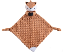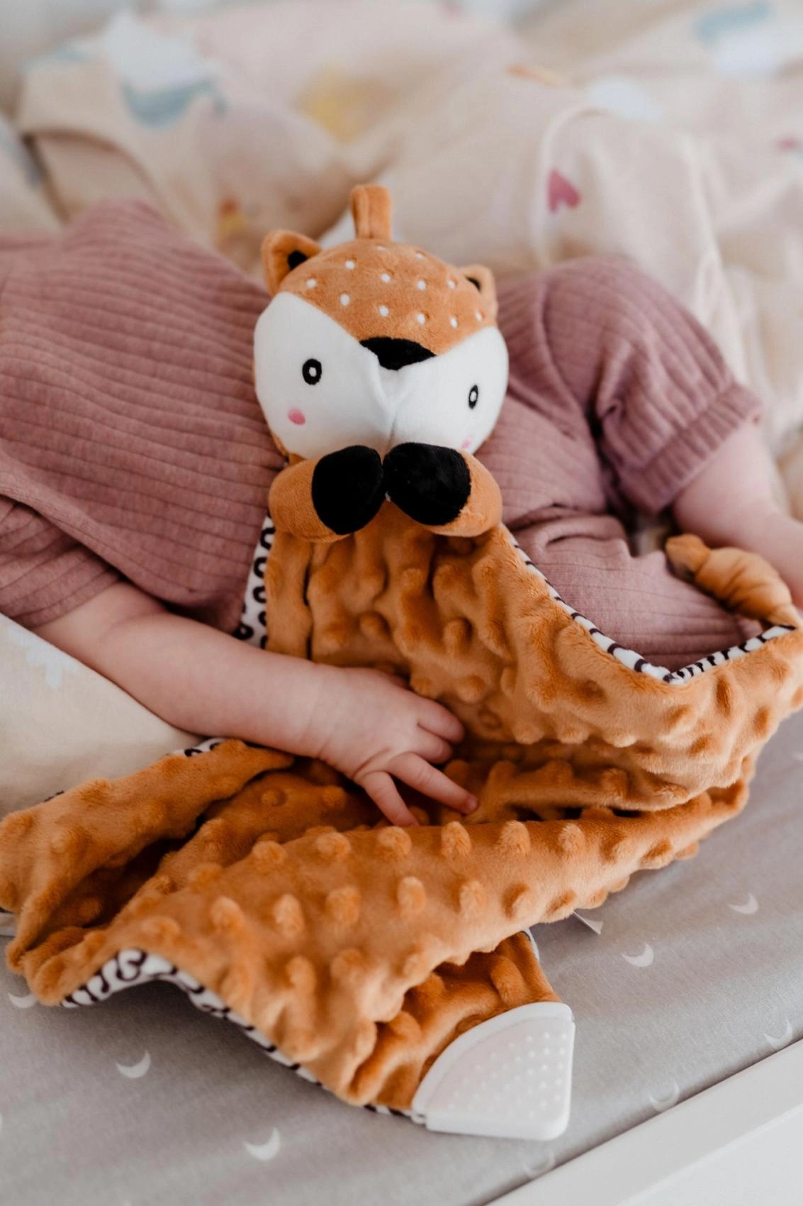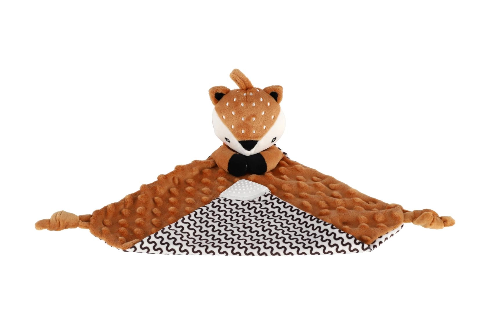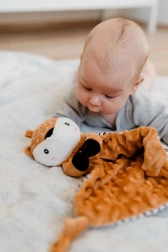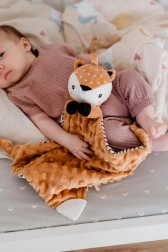 Очарователното одеялце за заспиване с животинче е идеално за бебета още от раждането. Меко минки платно с 3D точки успокоява, меката гризалка облекчава при никнене на зъбки, а нежната дрънкалка стимулира любопитството и развива слуха. Продуктът е сертифициран в ЧР за максимална безопасност.