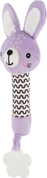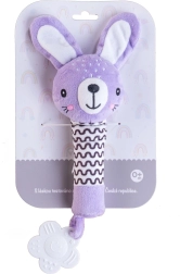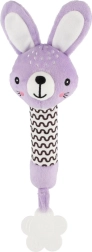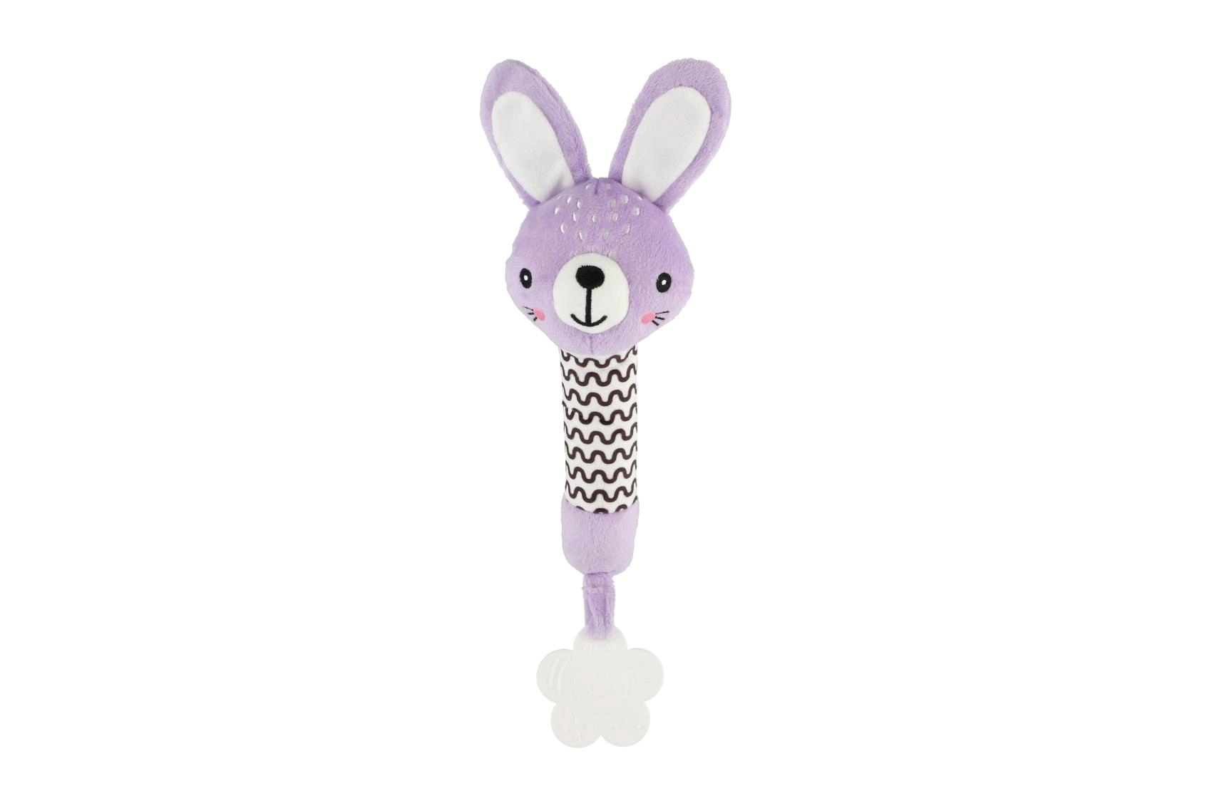 Лилавото плюшено зайче е идеалната първа играчка за новородени. Лекият дизайн и дългото меко телце се държат отлично в малките ръчички, а при натискане издава нежен пищящ звук, който естествено привлича вниманието на бебето и подпомага възприемането на звуците.
