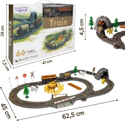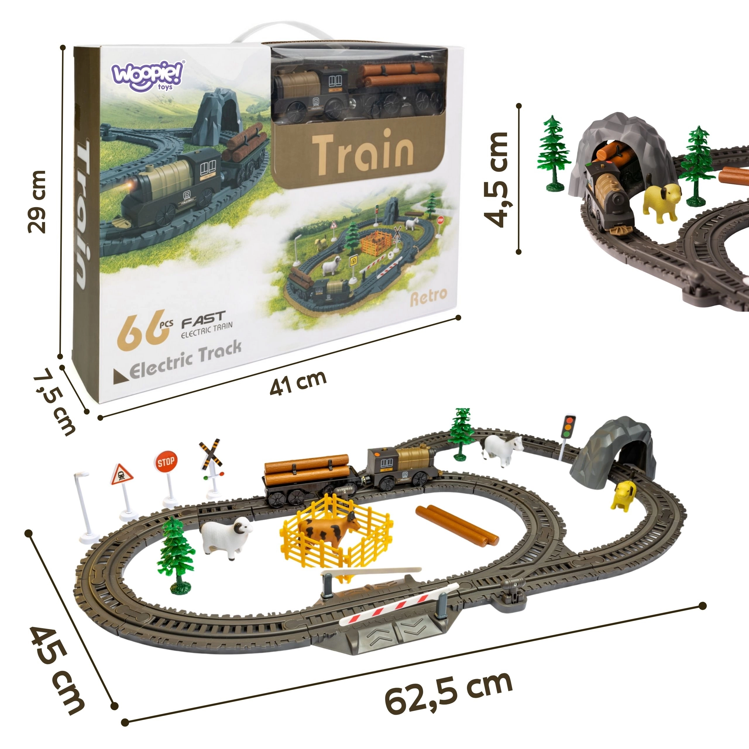 Тази ретро електрическа железопътна линия WOOPIE носи часове забавление за деца и възрастни. Батерийният локомотив се движи напред и назад, свети с предна светлина и плавно преминава по цветните релси благодарение на добре проектираните стрелки. Благодарение на богатото оборудване могат да се строят различни маршрути и сценарии – от прости кръгове до разклонени линии.