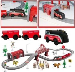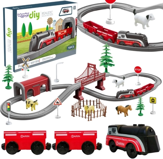 Отправете се на живописно пътешествие из фермата с електрическата влакова линия WOOPIE в богат комплект от 70 части. Локомотив с електрическо задвижване, магнитни вагони и тунел и мост превръщат всяка игра в реалистично приключение. Децата създават свои сцени благодарение на животните, пътните знаци и декорациите, развивайки фантазията, логиката и фината моторика.