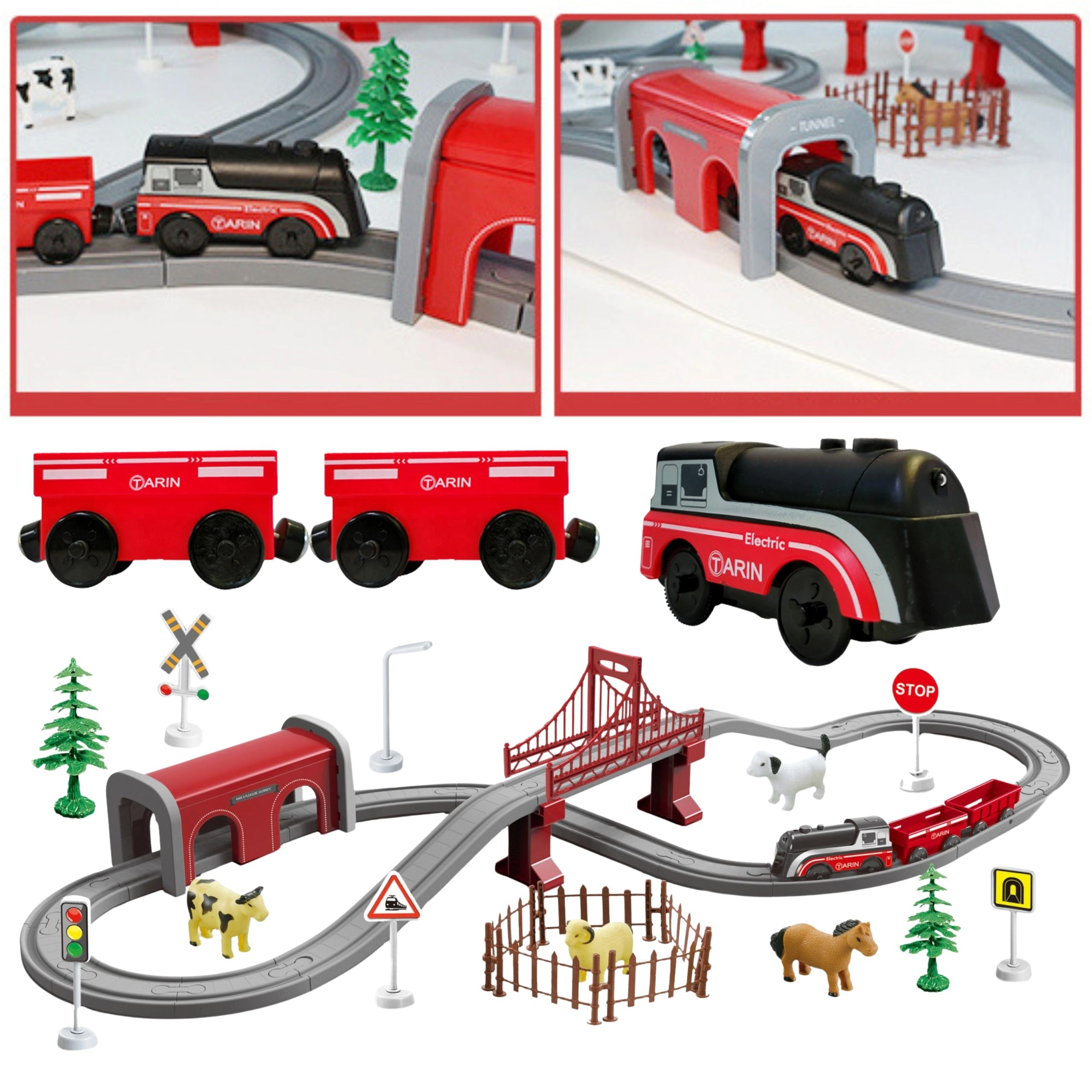 Тази електрическа влакова линия WOOPIE носи на децата от 3 години нагоре дълги часове творческо забавление. Благодарение на магнитните съединители вагоните се свързват лесно и стабилно, локомотивът с AAA батерия осигурява реалистично движение, а трасето с мост и тунел създава атрактивна фермерска сцена.