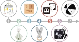 - висящ мобил, контрастни карти, мека топка, плюшен зайчик, шумоляща контрастна книжка, дървено гризалка „Зайче“, дървени блокчета за етапи