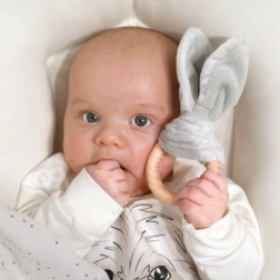 Дървено гризалка с текстилни „ушички“ се държи лесно и от най-малките ръчички, помага при никнене на зъби и подпомага координацията ръка–око.