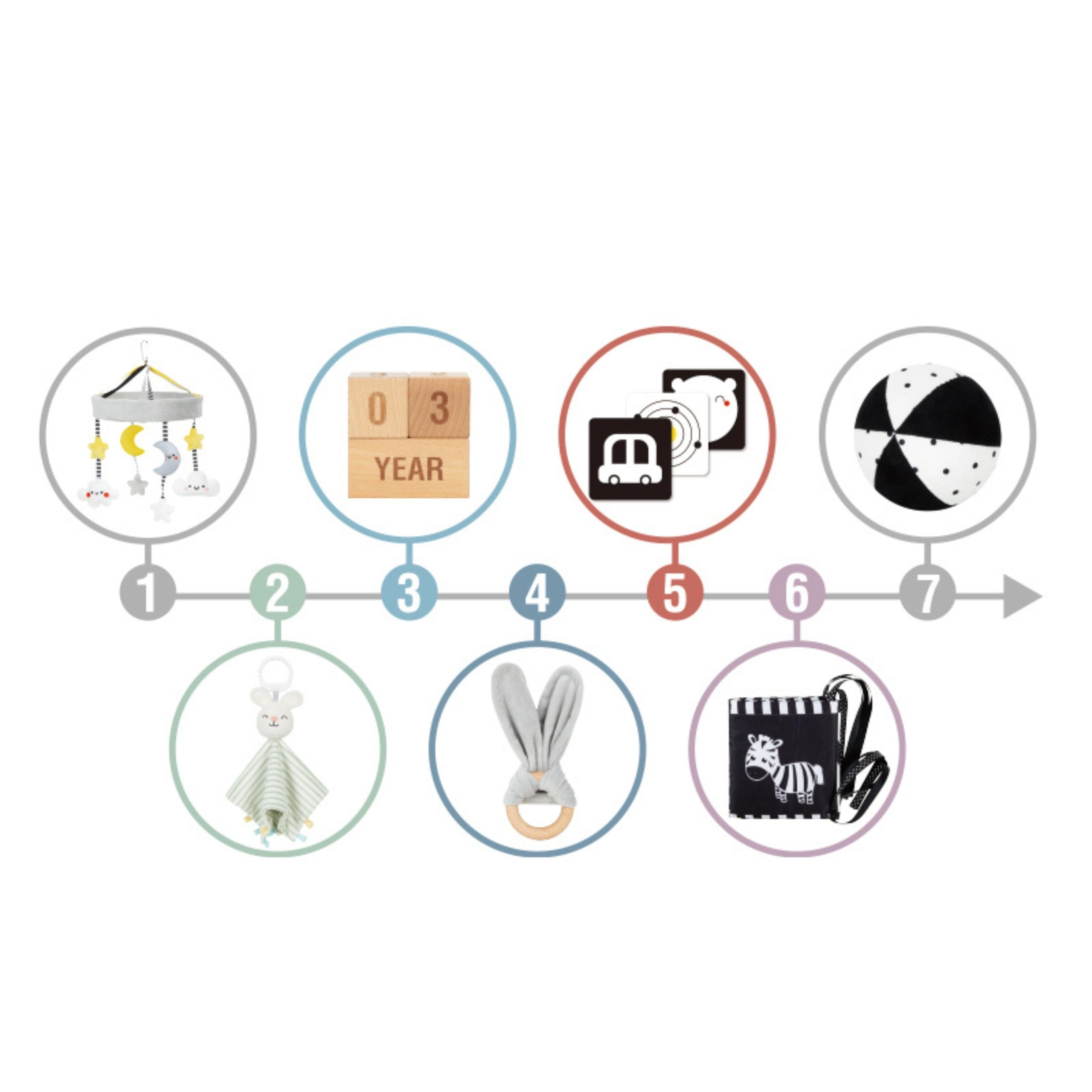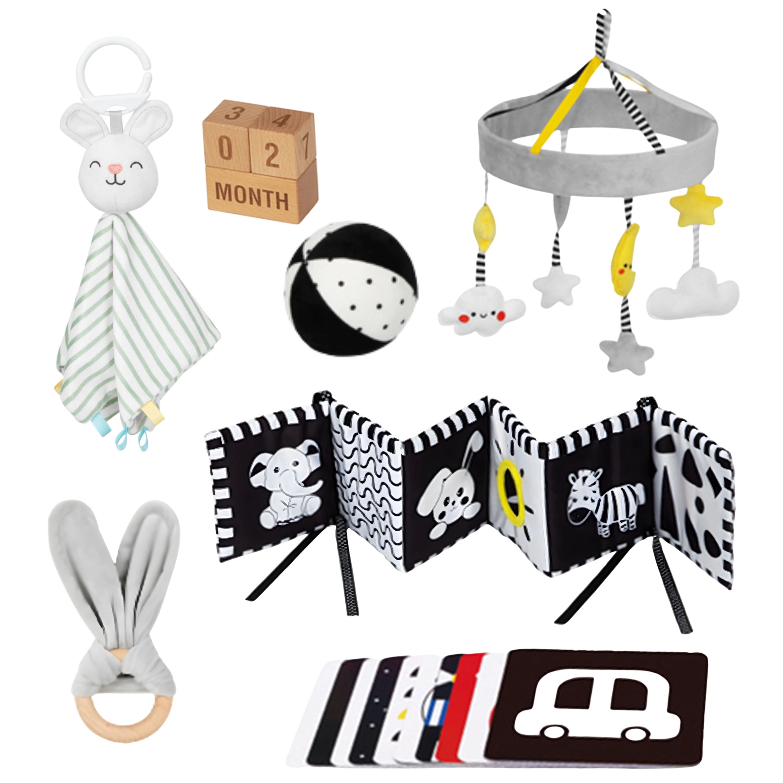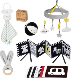 Този добре обмислен комплект предлага 6 дидактически помагала и аксесоари за заснемане на важни моменти. Висококонтрастните шарки привличат вниманието на бебето и подпомагат визуалното развитие, а меките текстури приканват към тактилно изследване. Леки, безопасни и лесни за захващане елементи насърчават фината моторика и първите фокусирани игри.
