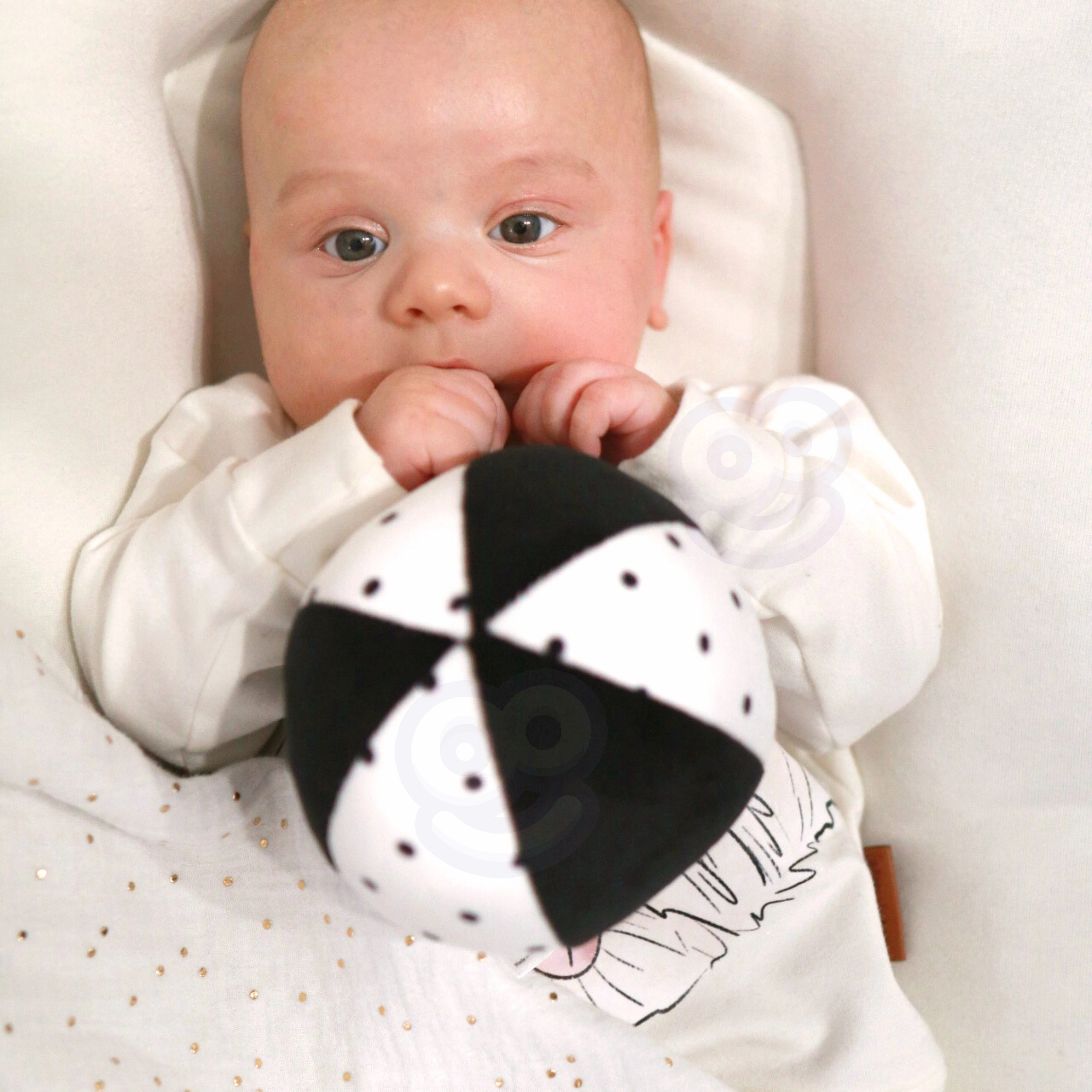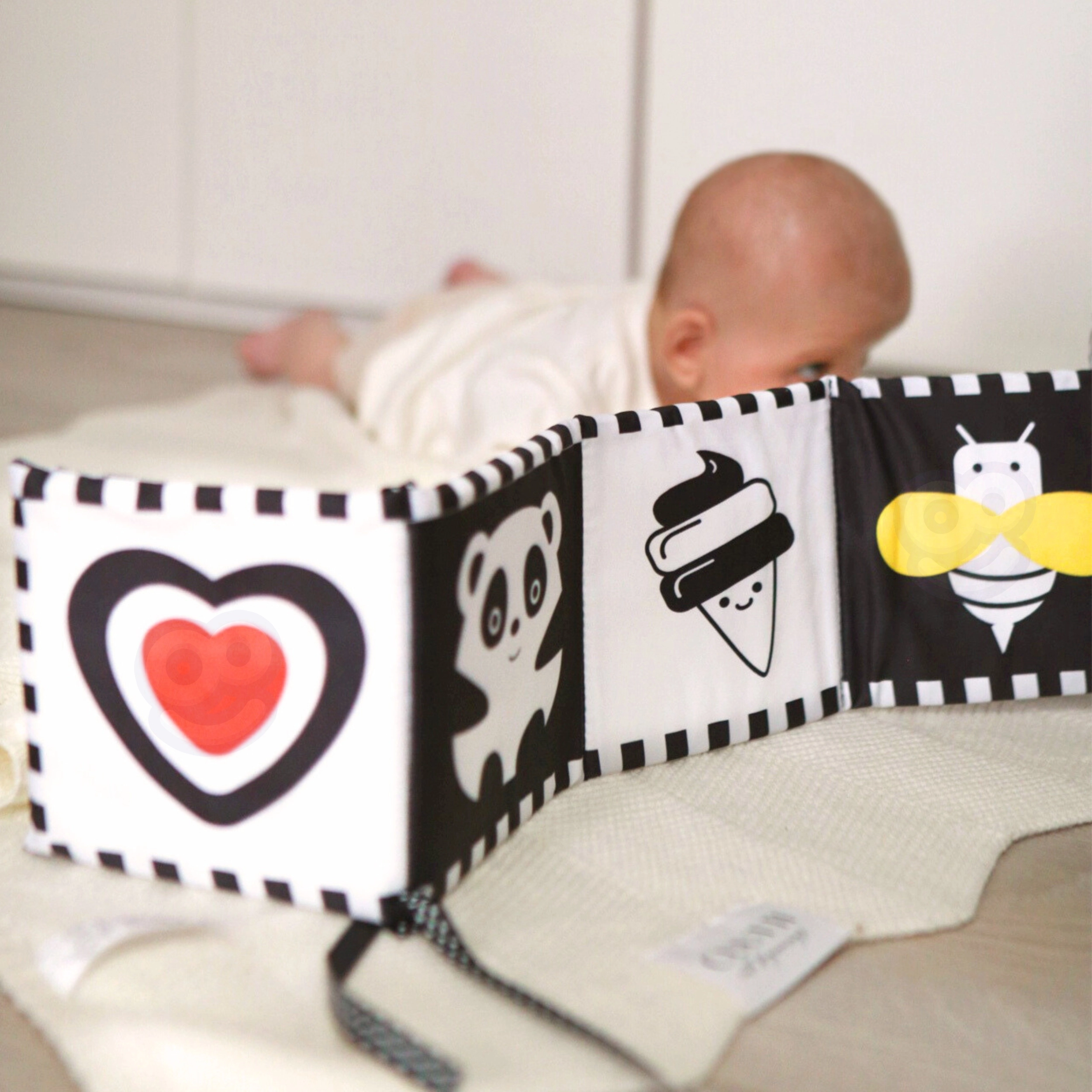 Черно-белите шарки върху картите, книжката и панела естествено привличат погледа на новороденото, подпомагат първото фокусиране и удължават времето на концентрация по време на tummy time.