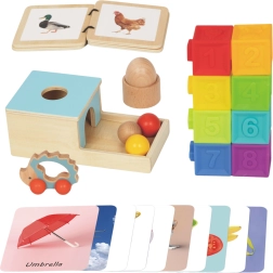 - Дървено яйчице и чашка; дървена кутия за постоянство на обекта с 3 топчета; 10 картонки с картинки (20 мотива); 8 меки сензорни кубчета с числа, форми и животни; дървена книжка с животни; дървена дрънкалка – количка таралеж; печатен наръчник за родители