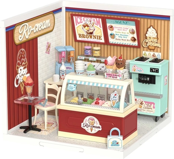 Сглобете си собствена ретро сладкарница за сладолед с нежни пастелни детайли и функциониращо LED осветление. Този мини DIY комплект от марката ROLIFE предлага бързо сглобяване с ниска трудност, забавни декорации и реалистични елементи – от щанд с ванички до машина за мек сладолед. Идеален като подарък и стилна декорация за интериора.