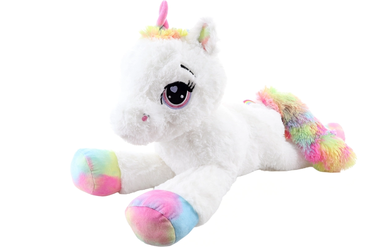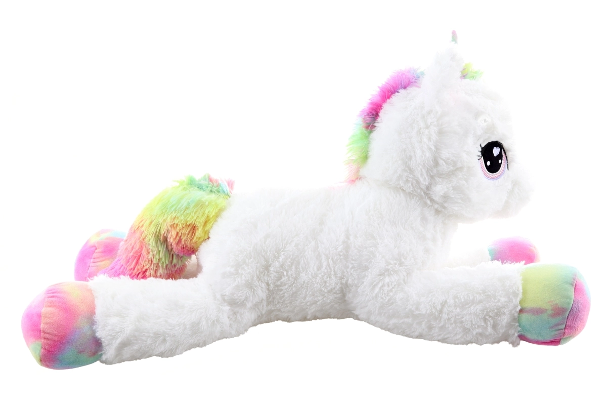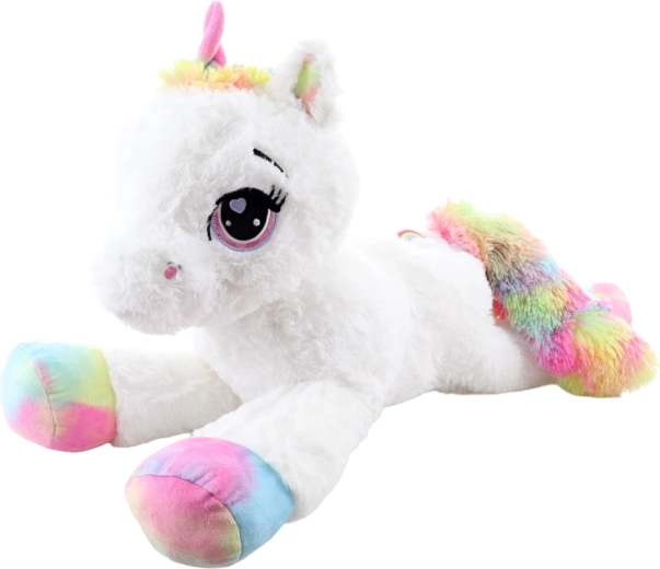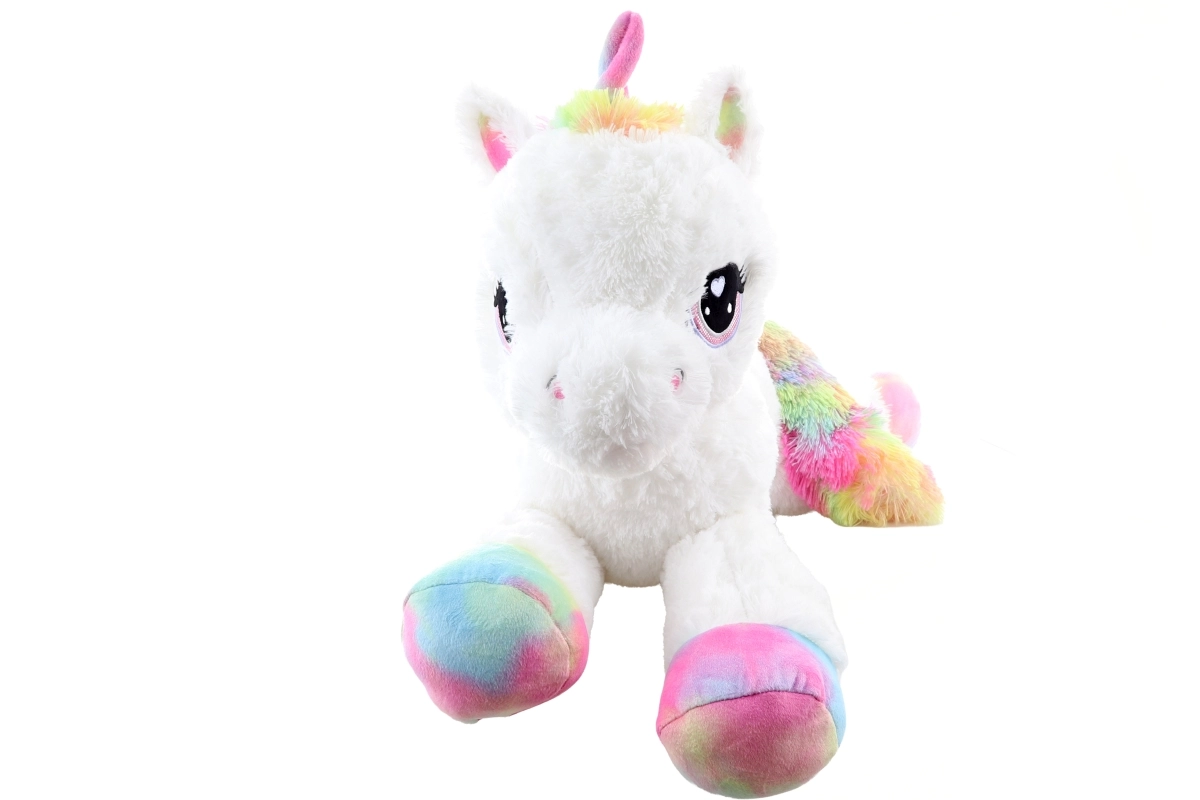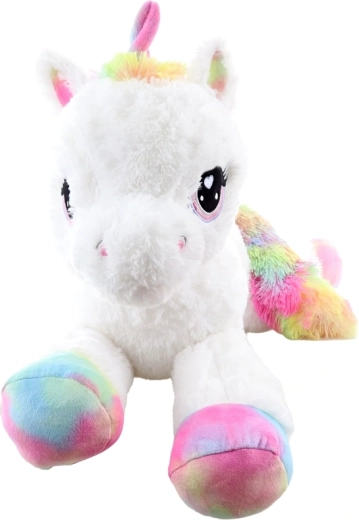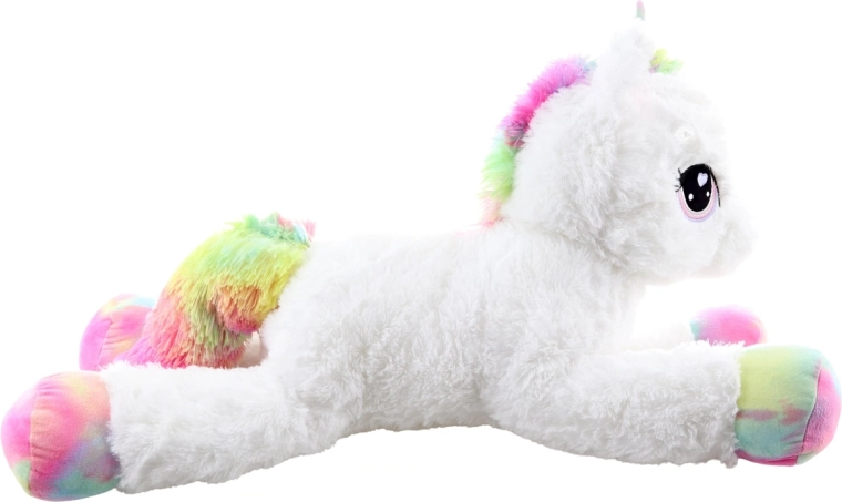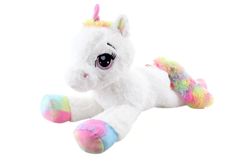 Това бяло плюшено еднорогче с дъгови копитца, грива и опашка ще стане верен спътник както за отдих, така и за игра. Изработено е от изключително нежна плюшена материя, която кани към прегръдка, а благодарение на легналата поза прекрасно пасва върху леглото и в детската стая.