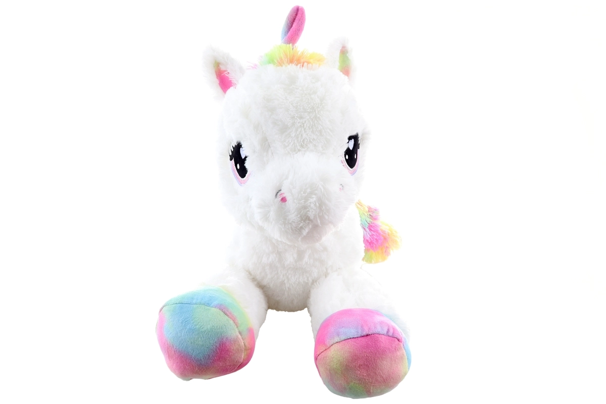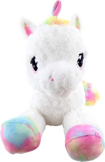Очарователното плюшено еднорогче с дължина 80 см ще зарадва както деца, така и възрастни. То е изключително меко, приятно на допир и идеално за гушкане. Цветните дъгови детайли придават на играчката вълшебна визия, големите бродирани очи и нежната изработка гарантират безопасно ползване от 0+.