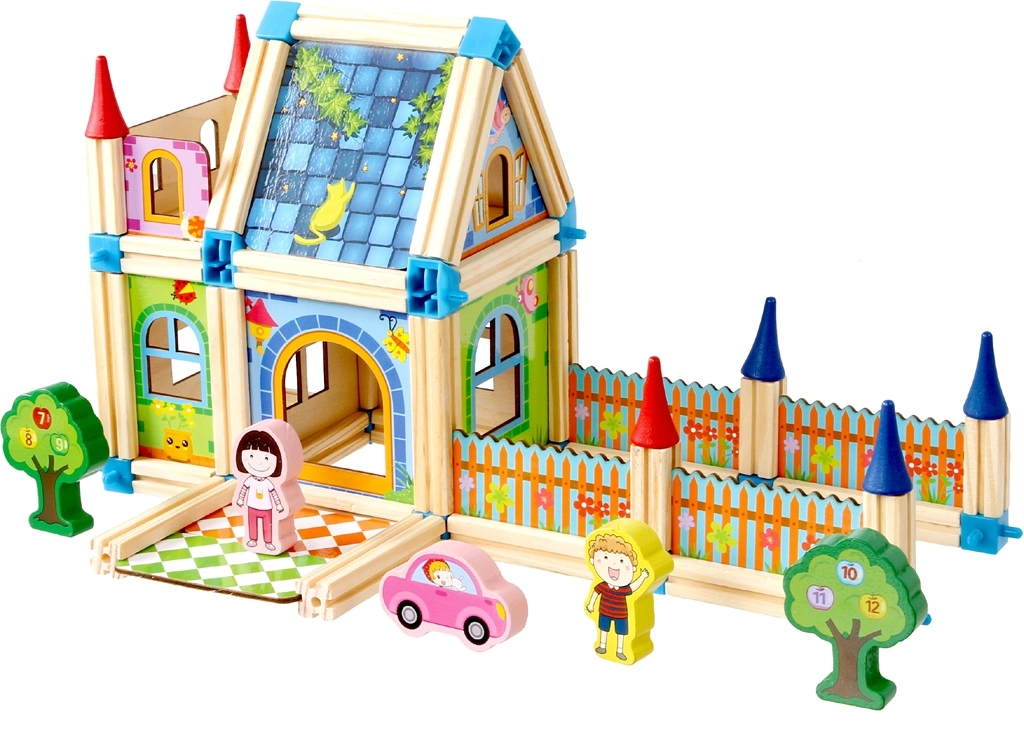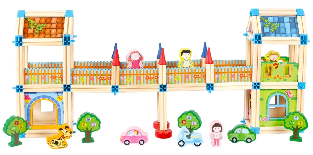 Модулните части и съединители позволяват създаване на разнообразни постройки – от високи кули до оградени дворчета и мостове. Децата могат да изграждат цели сцени за свободна игра.
