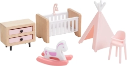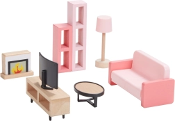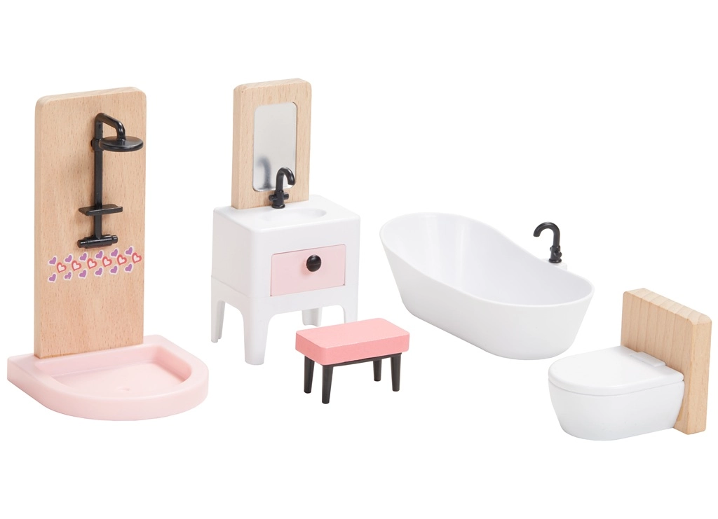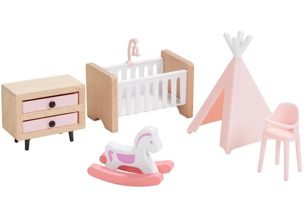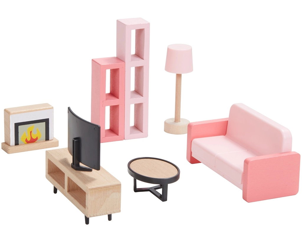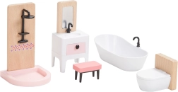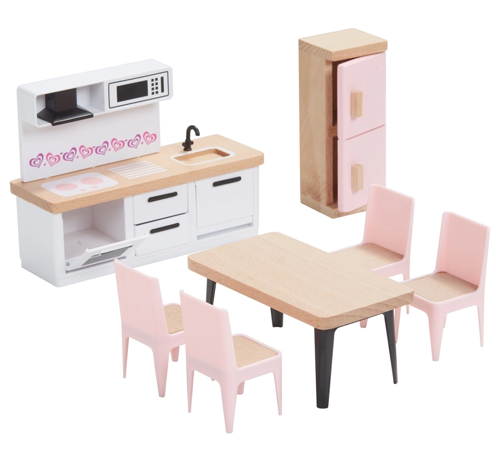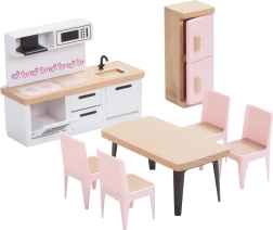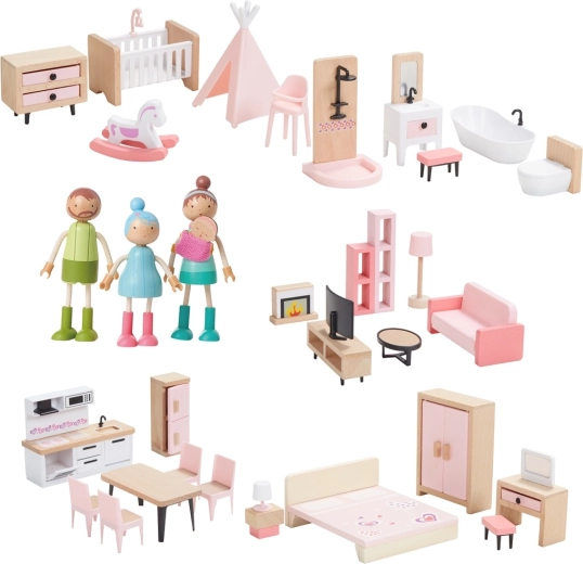Този универсален комплект мебели за къщичка предлага всичко, което децата имат нужда, за да създадат уютен дом за своите фигурки. Включва оборудване за спалня, кухня, всекидневна, баня и детска стая в хармонична комбинация от естествено дърво и нежни розови акценти. Не липсва и цялото семейство с гъвкави крайници за автентични сцени и ролеви игри.