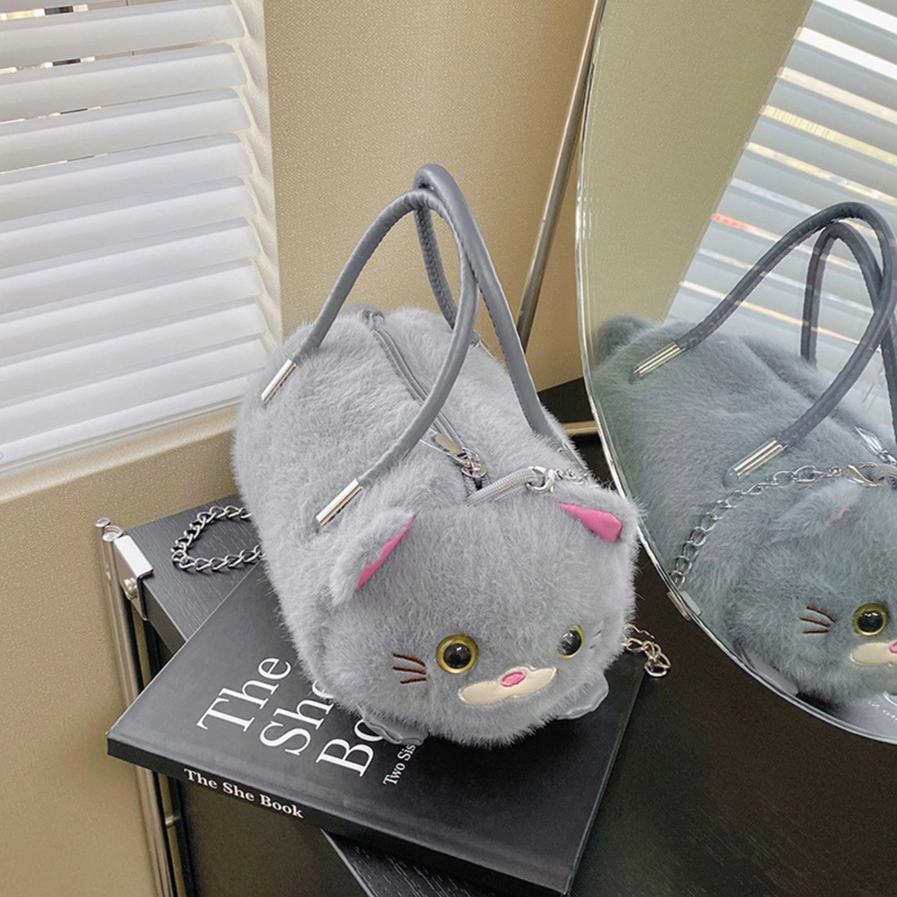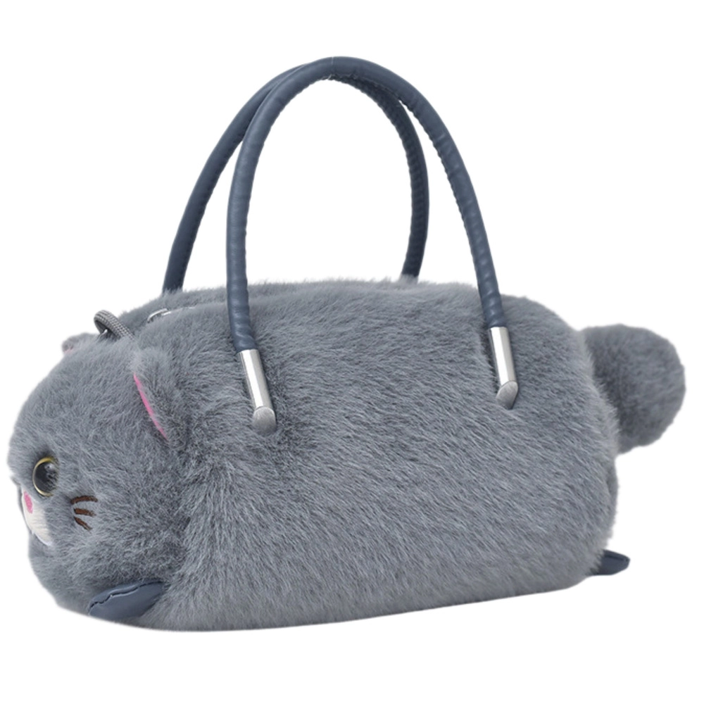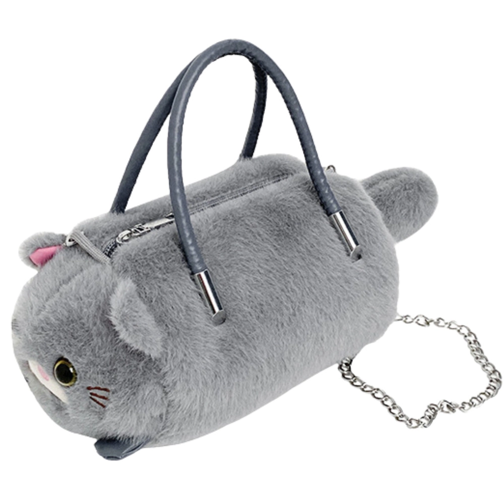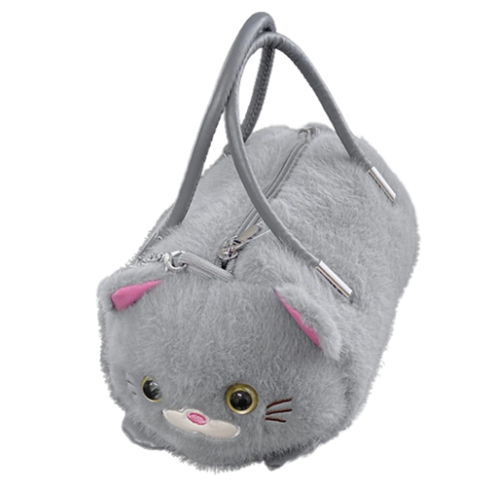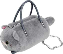Очарователна сива чанта във форма на коте, която съчетава мек пухкав плюш с практичен дизайн. Има две здрави дръжки, сваляема метална верижка за носене през рамо и сигурно закопчаване с цип. Идеална за дребни вещи за деца, тийнейджъри и възрастни, които обичат оригинални аксесоари.