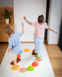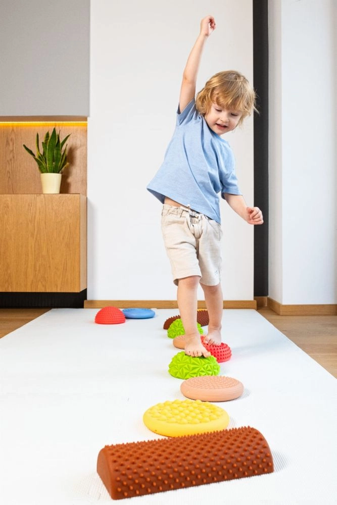 Комплектът включва комбинация от куполи, дискове и полувалове, които могат свободно да се разполагат в прави линии или игрови кръгове. Благодарение на здравата, но еластична конструкция и неплъзгащото се покритие елементите са безопасни върху равни подове и тренировъчни постелки. Подходящи за домашни упражнения, детски градини, училища, физиотерапия и сензорна интеграция.