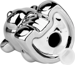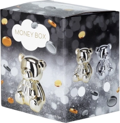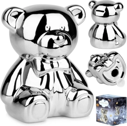 Елегантна касичка във формата на мече с лъскава сребърна повърхност тип огледален блясък, която красиво отразява светлината и служи като стилна декорация и практично място за спестявания. Благодарение на отвор в долната част лесно изваждате монетите без счупване. Идеален подарък за деца и възрастни.